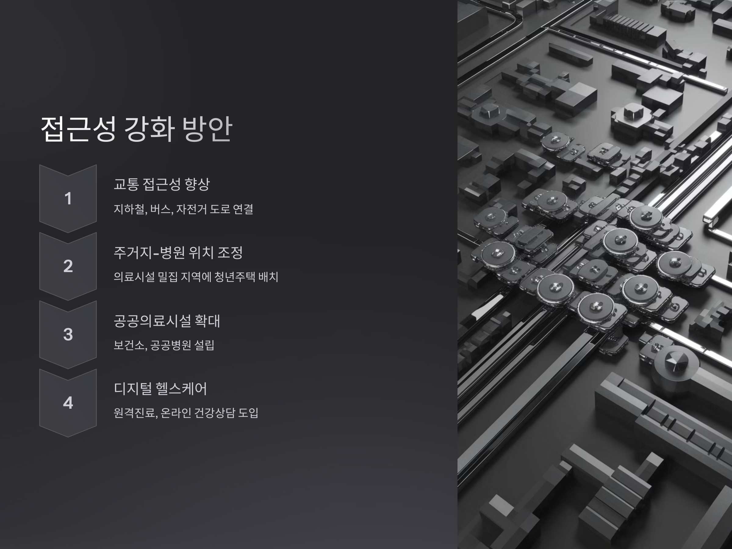교통망을 잘 연결하거나, 디지털 헬스케어 서비스를 도입하는 방법 등이 있습니다. 또한, 공공의료시설을 근처에 배치하는 것도 좋은 방법입니다.