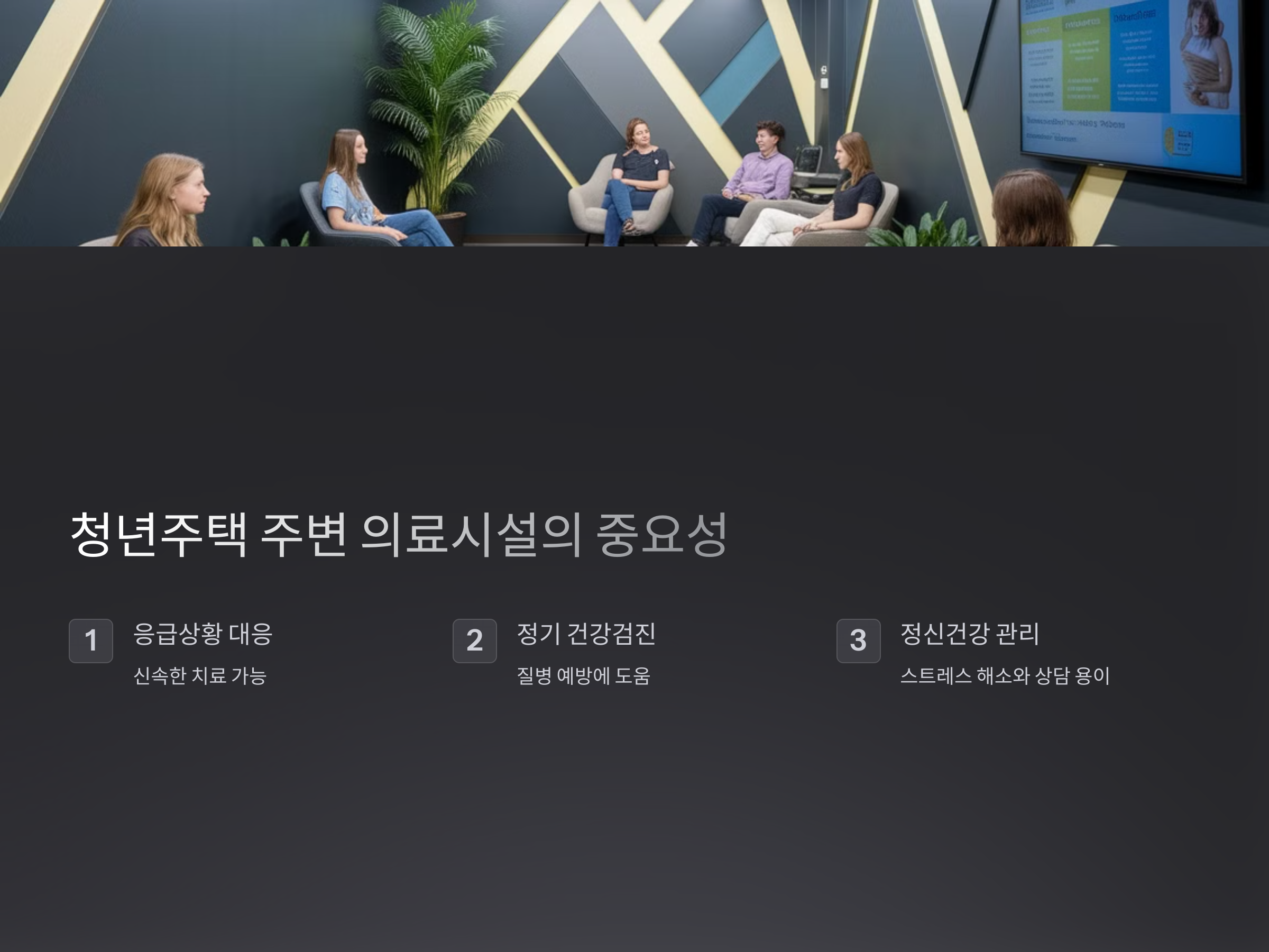 청년주택이 건설될 때, 병원이나 의료시설과의 거리를 고려하여 위치를 선정하는 것이 중요합니다. 예를 들어, 의료시설 밀집 지역에 청년주택을 배치한다면, 주민들이 병원을 쉽게 이용할 수 있습니다. 또한, 청년주택 내에서 병원까지 가는 셔틀버스나 무료 교통편을 제공하는 것도 좋은 방법입니다.