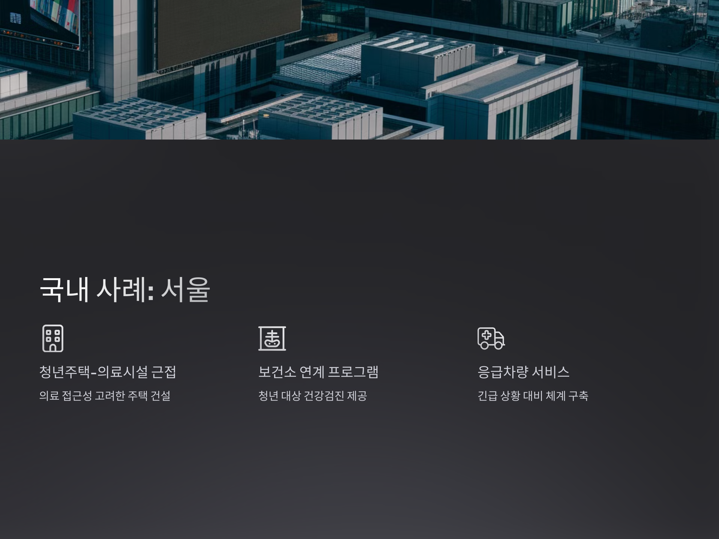 전 세계적으로 청년주택의 병원 및 의료시설 접근성을 높이기 위한 다양한 시도가 이루어지고 있습니다. 그 중 몇 가지 대표적인 사례를 살펴보겠습니다.