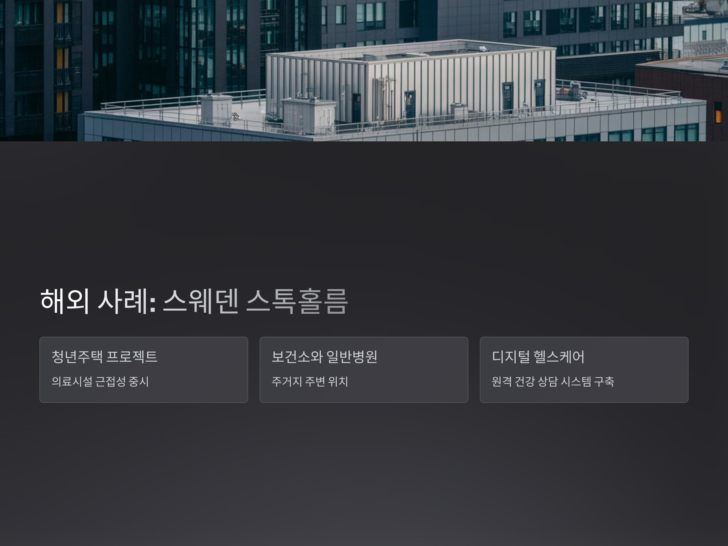 스웨덴의 수도 스톡홀름은 청년주택 프로젝트를 진행할 때 의료시설과의 근접성을 매우 중요하게 여깁니다. 주거지 주변에 보건소와 일반병원이 위치해 있어 주민들이 빠르게 진료를 받을 수 있습니다. 또한, 이 지역에는 디지털 헬스케어 서비스도 도입되어 원격으로 건강 상담을 받을 수 있는 시스템이 갖추어져 있습니다.