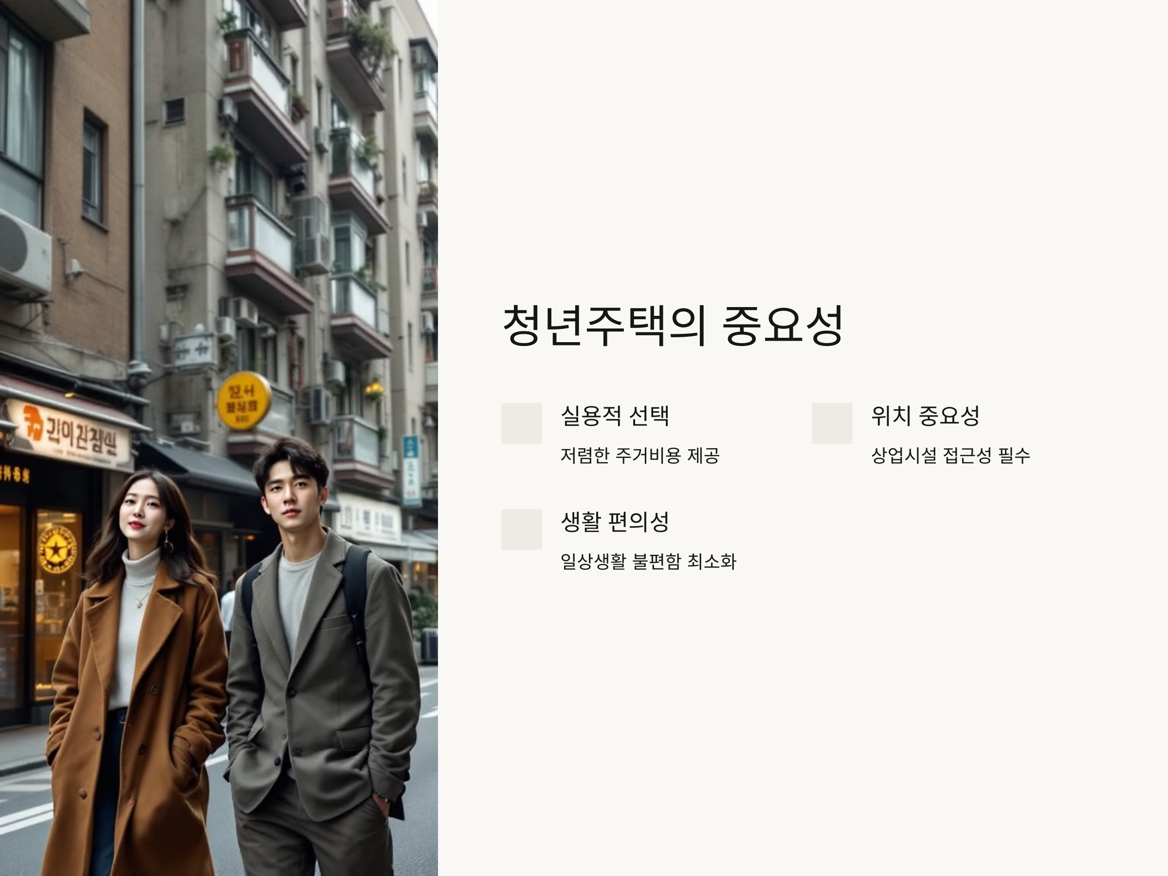 청년주택은 저렴한 가격으로 주거 공간을 제공하지만, 그만큼 생활의 질을 높이기 위한 편의시설도 중요합니다. 특히, 청년주택 주변에 위치한 편의점과 마트는 청년들의 일상적인 생활을 편리하게 만들어주는 중요한 요소입니다. 따라서, 청년주택을 선택할 때는 주변의 상업시설들이 얼마나 잘 갖춰져 있는지, 그리고 접근성이 좋은지 여부가 중요한 판단 기준이 됩니다.