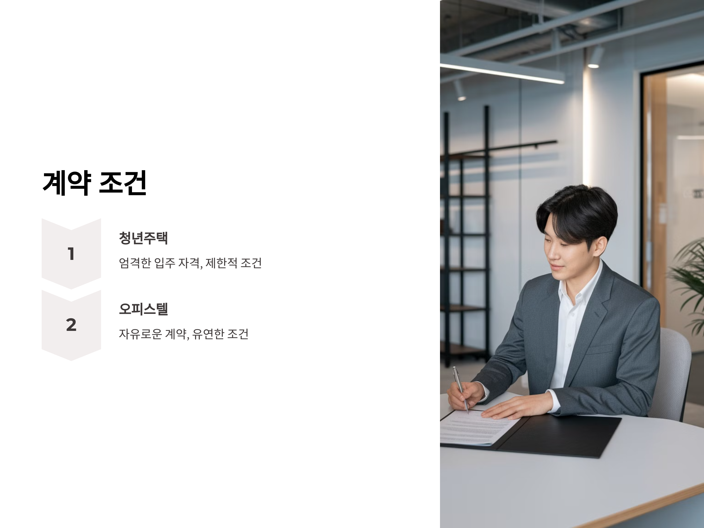 청년주택은 입주 자격이 제한적이고, 계약 조건도 엄격할 수 있습니다. 반면, 일반 오피스텔은 자격 제한이 없고, 자유로운 계약 조건을 제공하므로 유연한 선택이 가능합니다.