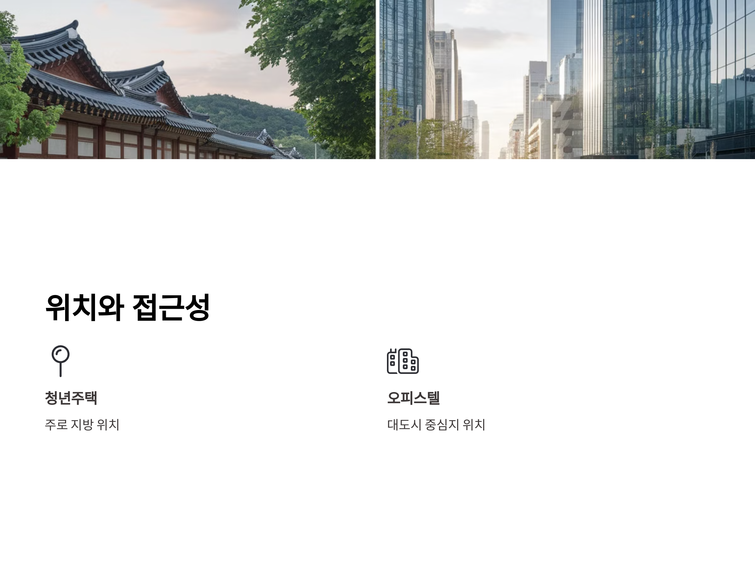 청년주택은 보통 대도시보다는 지방에 위치하는 경우가 많습니다. 이는 청년들이 일자리를 구하거나 활동을 위해 대도시로 이동할 때 불편함을 겪을 수 있습니다. 반면, 일반 오피스텔은 서울 및 주요 도시 중심지에 위치해 있어, 직장과 학교 등에 접근성이 좋습니다.