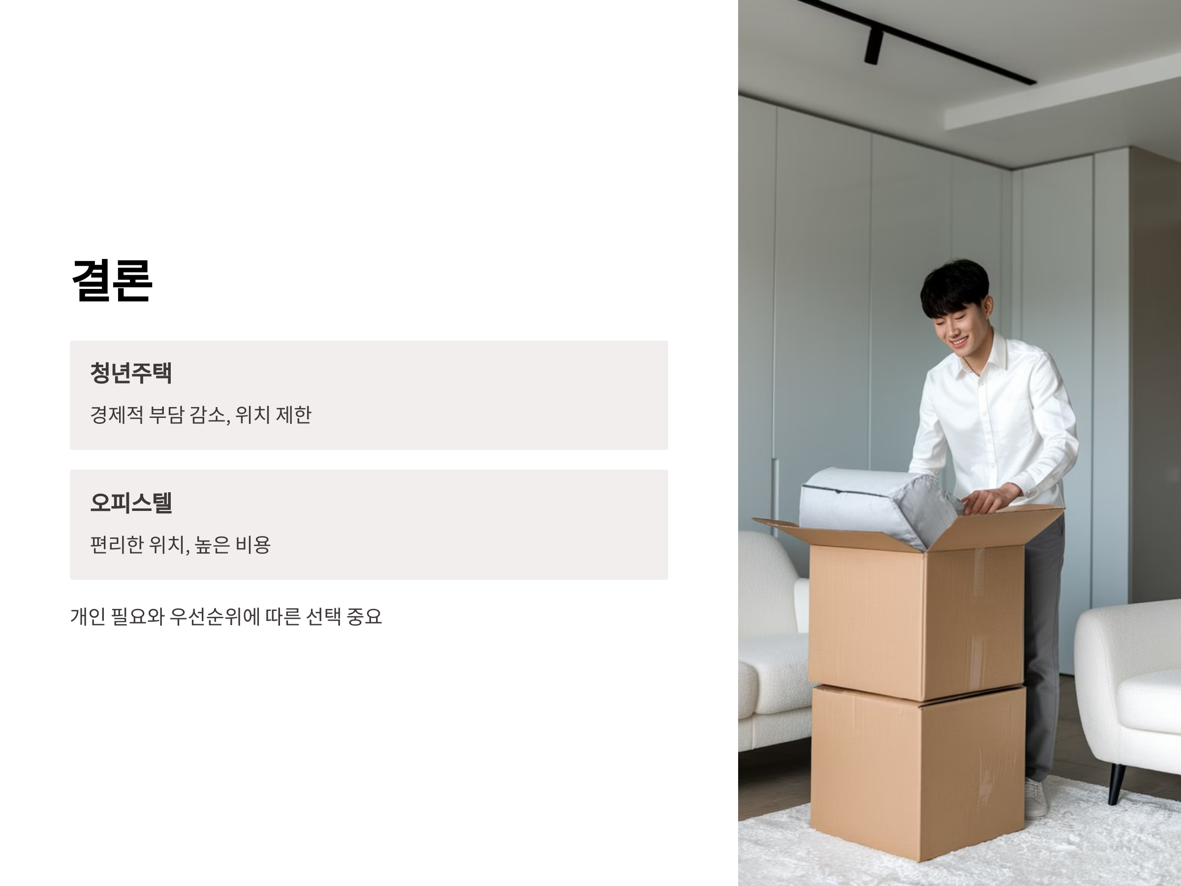 청년주택과 일반 오피스텔은 각기 다른 장단점이 있으므로, 자신의 상황에 맞게 신중하게 선택해야 합니다. 청년주택은 경제적 부담을 덜 수 있는 좋은 선택이지만, 입주 자격과 위치에 제한이 있을 수 있습니다. 반면, 일반 오피스텔은 위치와 편의시설 면에서 우수하지만, 더 높은 비용이 발생할 수 있습니다. 각자의 필요에 맞는 최적의 주거지를 선택해 안정적인 생활을 만들어 가세요.