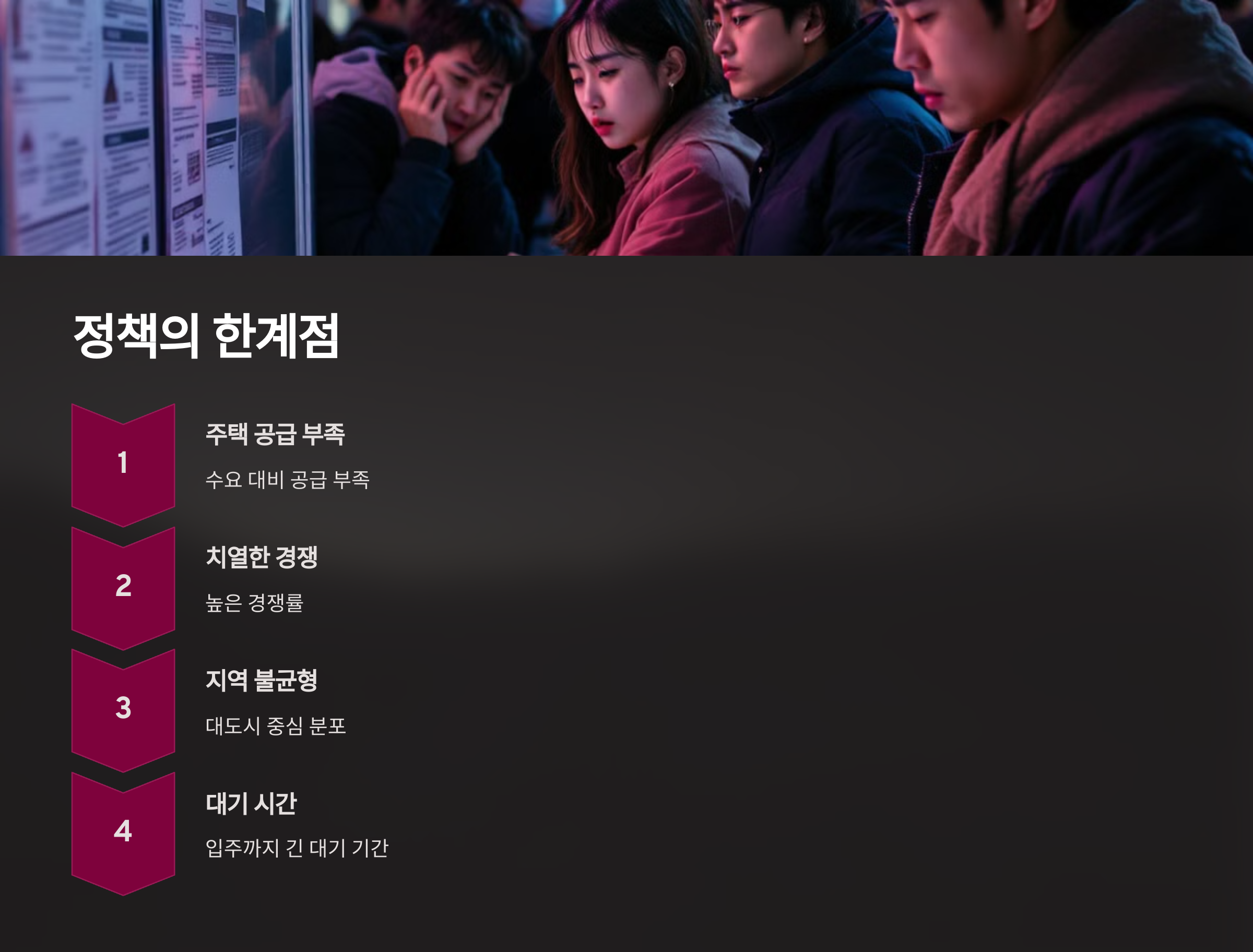 하지만 청년 임대주택 지원정책에도 몇 가지 단점이 존재합니다. 첫 번째는 주택 공급의 한계입니다. 많은 청년들이 주택 신청을 하더라도 경쟁이 치열하고, 주택 공급이 수요를 따라가지 못하는 경우가 많습니다. 이에 따라 청년들이 실제로 임대주택에 거주하기까지 상당한 시간이 소요될 수 있습니다.