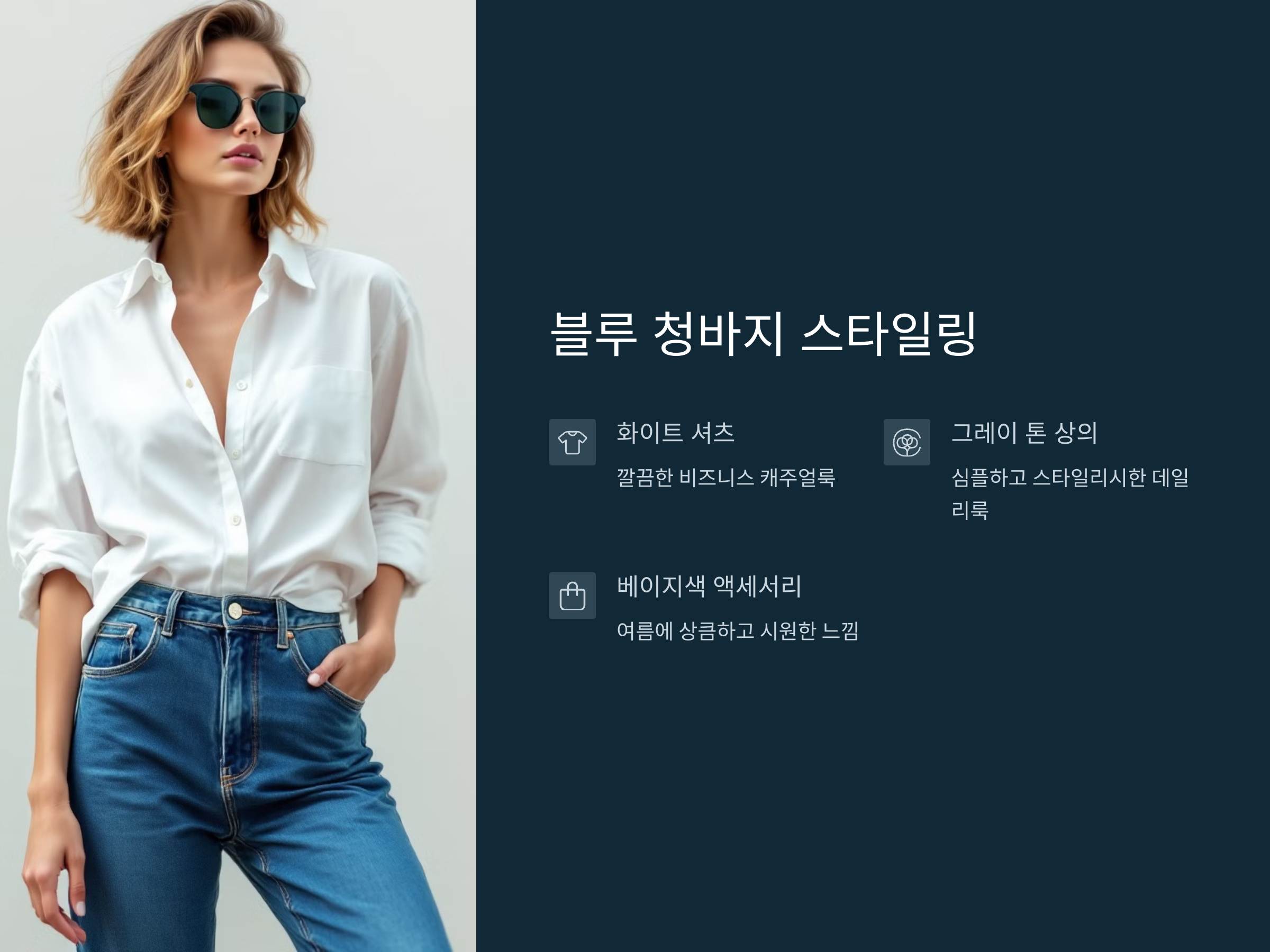 여름 액세서리 추가: 여름철에는 밝은 청바지와 함께 선글라스나 모자와 같은 여름 액세서리를 매치하면, 더욱 경쾌하고 즐거운 느낌을 연출할 수 있습니다.