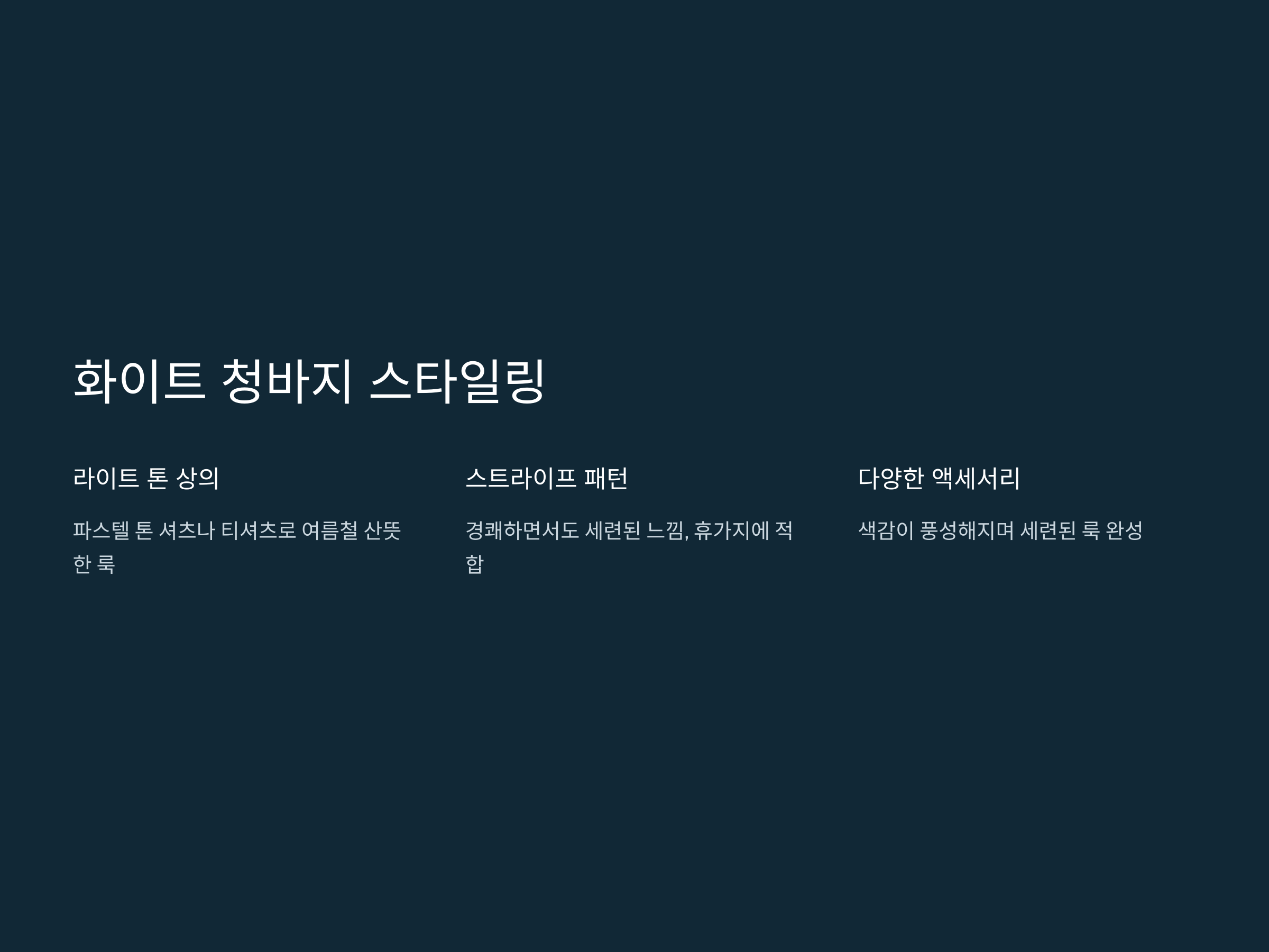 다양한 액세서리 활용: 화이트 청바지에 다양한 색상의 액세서리를 매치하면, 색감이 풍성해지며 더욱 세련된 룩을 완성할 수 있습니다.