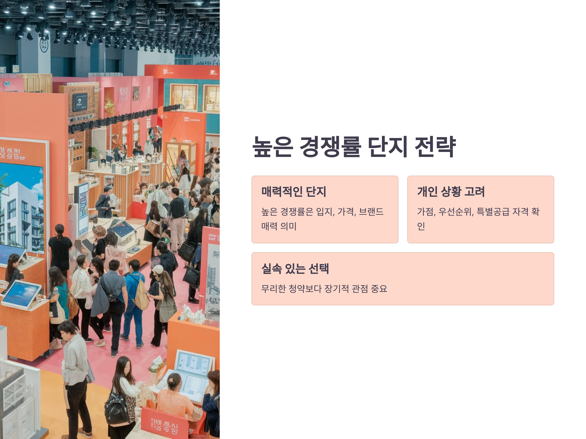 청약 경쟁률이 높다고 무조건 피해야 하는 것은 아닙니다. 경쟁률이 높다는 것은 그만큼 입지, 가격, 브랜드 등에서 매력적인 단지라는 뜻이기도 하니까요. 다만, 당첨 확률을 높이기 위해서는 전략적으로 접근할 필요가 있습니다.