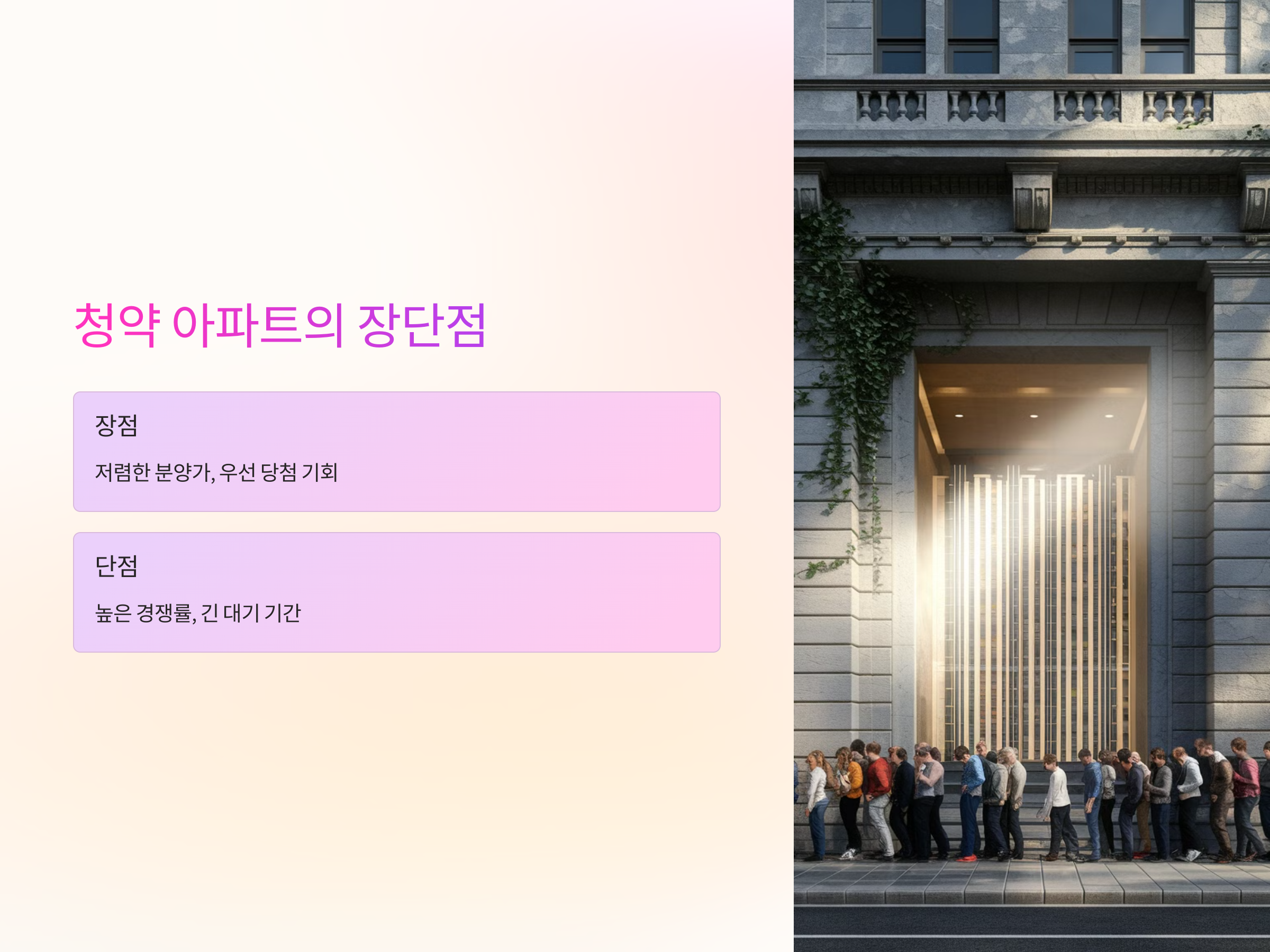 - 긴 대기 기간: 청약 아파트는 당첨 후 입주까지 시간이 오래 걸리는 경우가 많습니다.