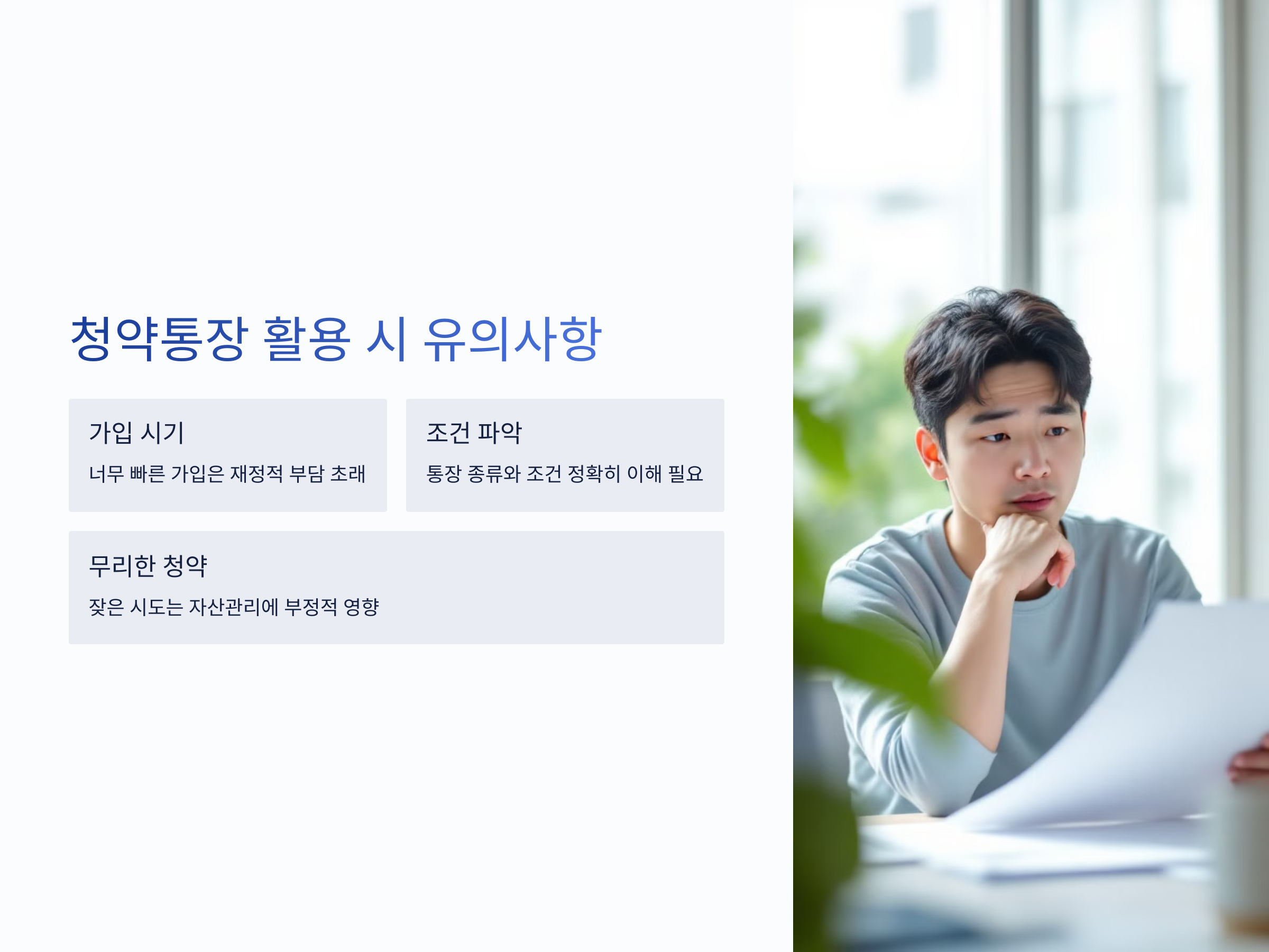 청약통장을 활용하는 데 있어 주의할 점도 많습니다. 잘못된 전략을 사용하면 청약통장의 효율성을 떨어뜨릴 수 있습니다. 이에 대한 유의사항을 아래와 같이 정리했습니다.