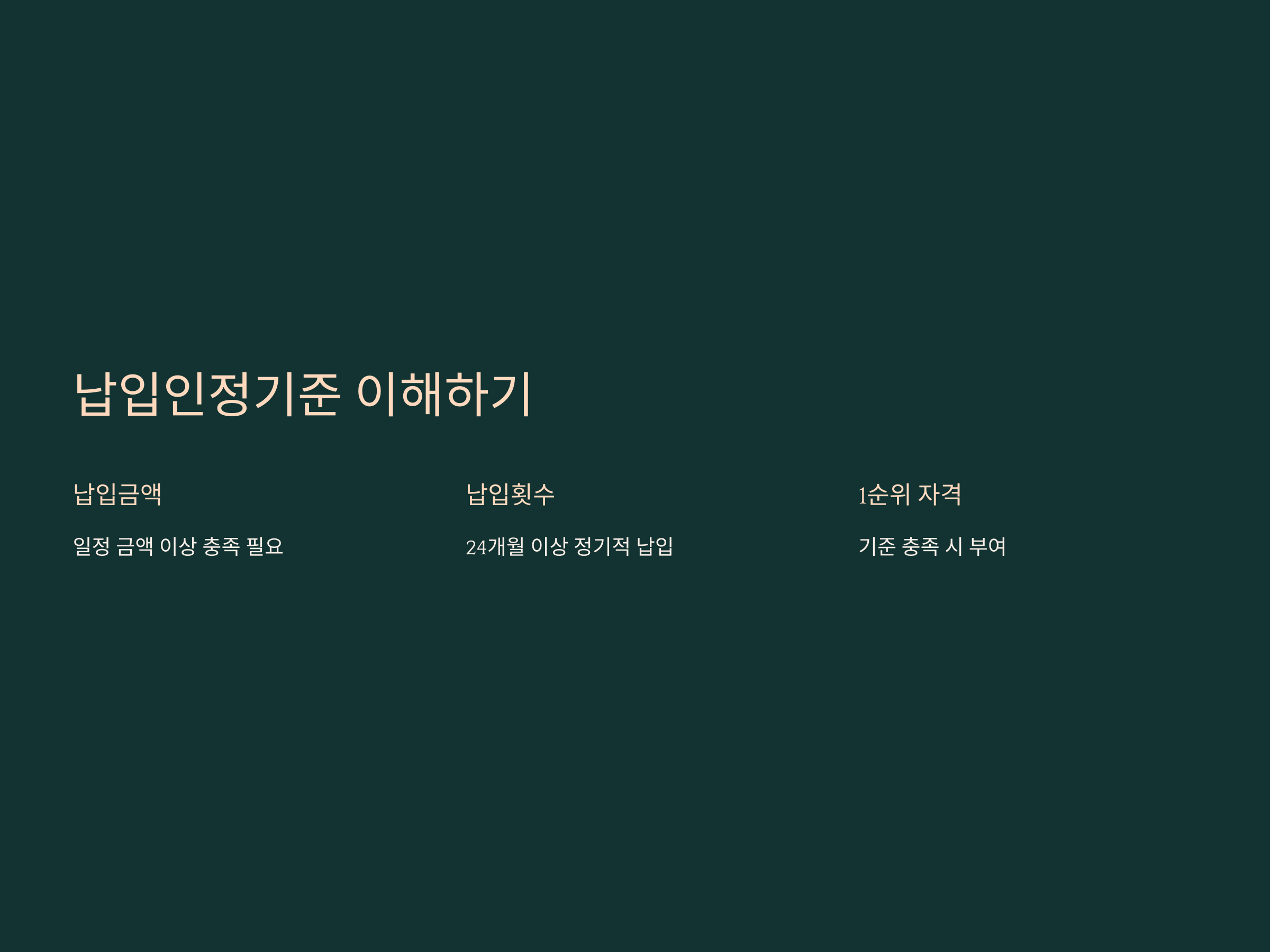 청약통장의 납입인정기준은 청약 자격을 얻는 데 중요한 역할을 합니다. 꾸준한 납입을 통해 1순위 자격을 얻고, 원하는 지역에서 주택을 청약할 수 있는 기회를 놓치지 않도록 준비하세요.