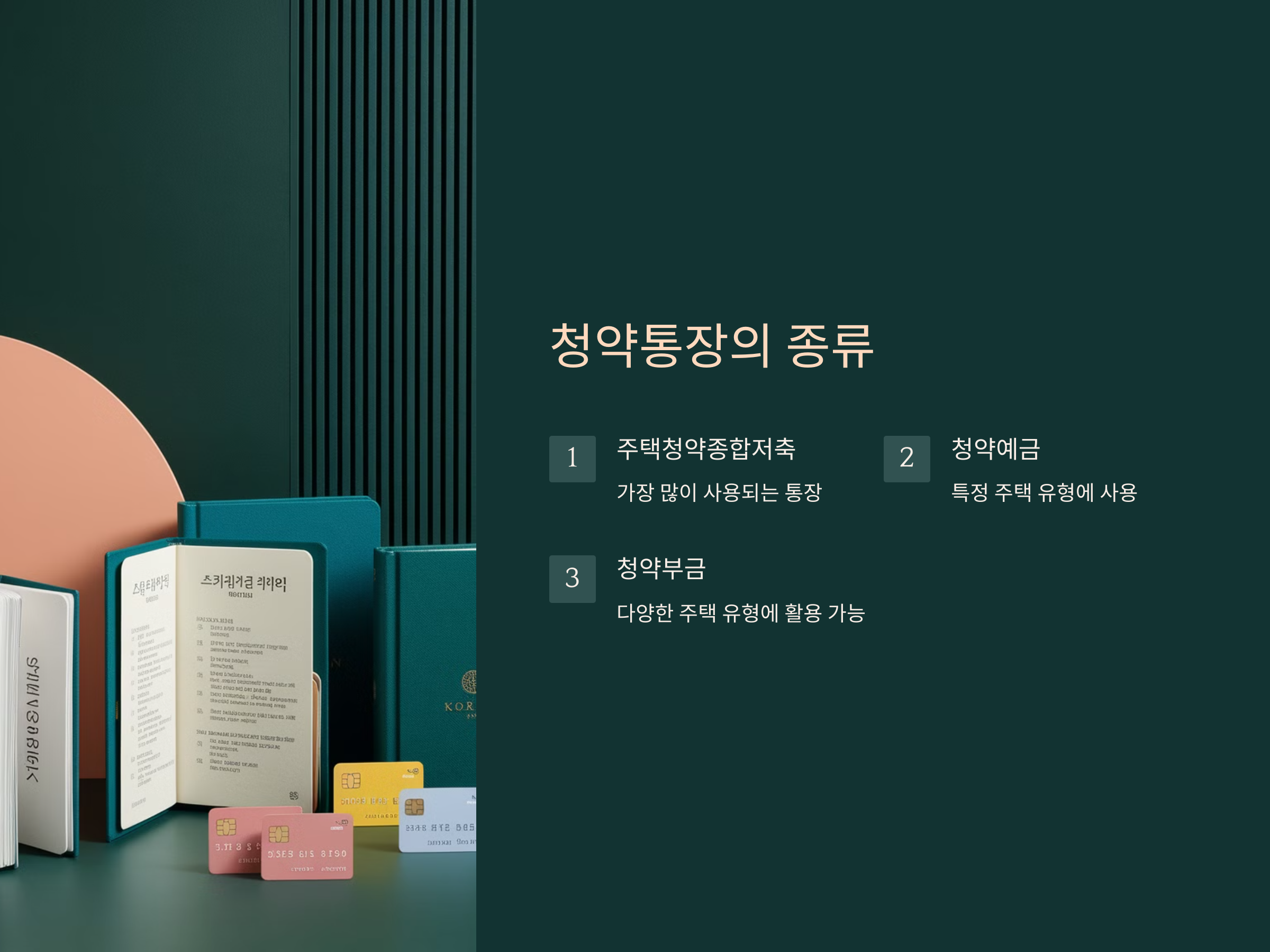 청약통장은 크게 주택청약종합저축과 청약예금, 청약부금 등으로 나눠집니다. 이들 각각은 청약을 위한 다양한 방식으로 기능하지만, 대부분 주택청약종합저축이 사용됩니다. 주택청약종합저축은 청약통장의 종류 중 가장 많이 사용되며, 이 통장에 납입된 금액에 따라 청약 자격이 주어집니다.