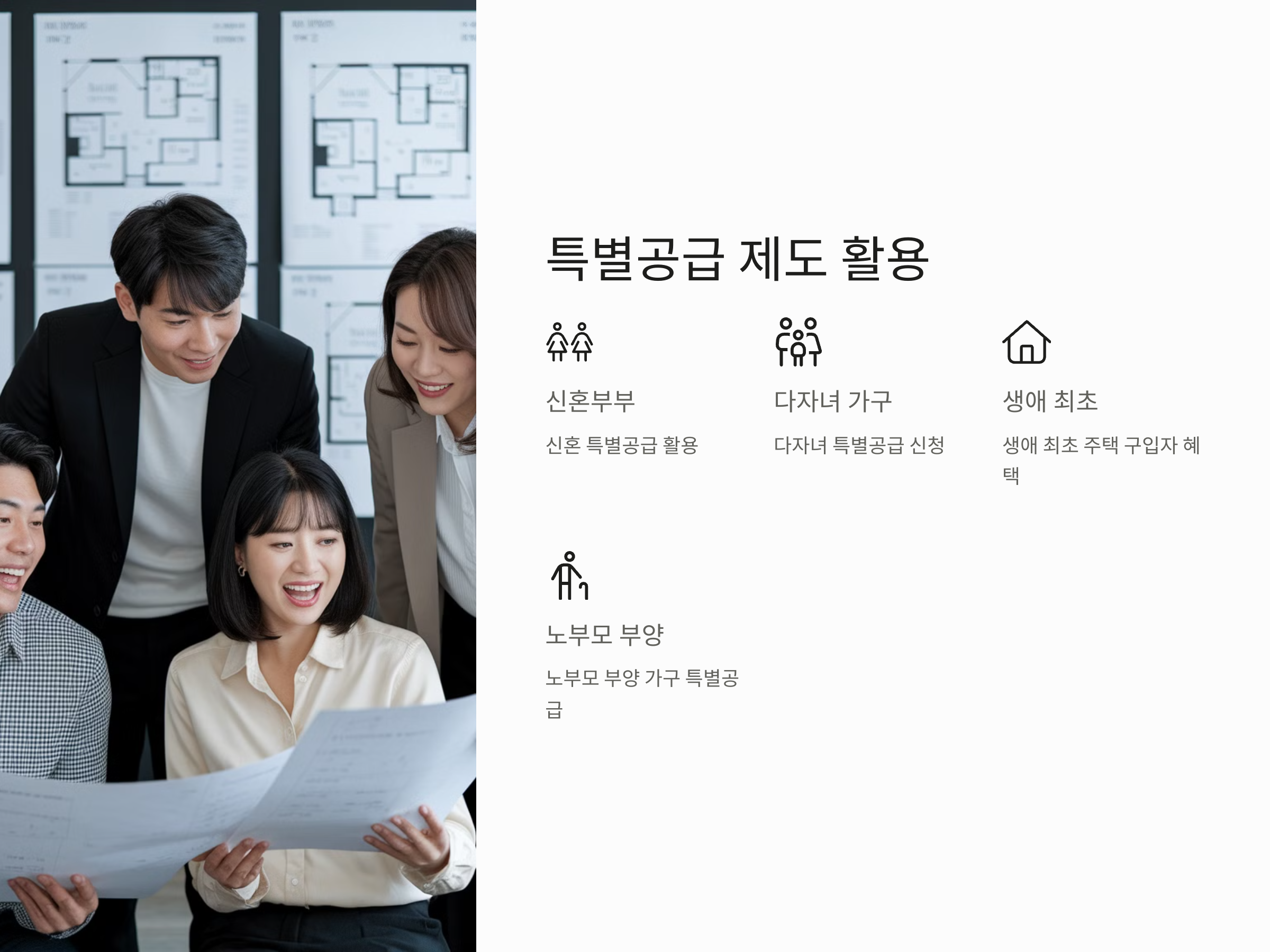 특별공급은 일반 청약보다 경쟁률이 낮아 당첨 확률이 높습니다. 신혼부부, 다자녀 가구, 생애 최초 주택 구입자, 노부모 부양 가구 등이 해당되며, 각 조건에 맞게 특별공급을 적극 활용하면 청약 성공 확률을 높일 수 있습니다. citeturn0search5