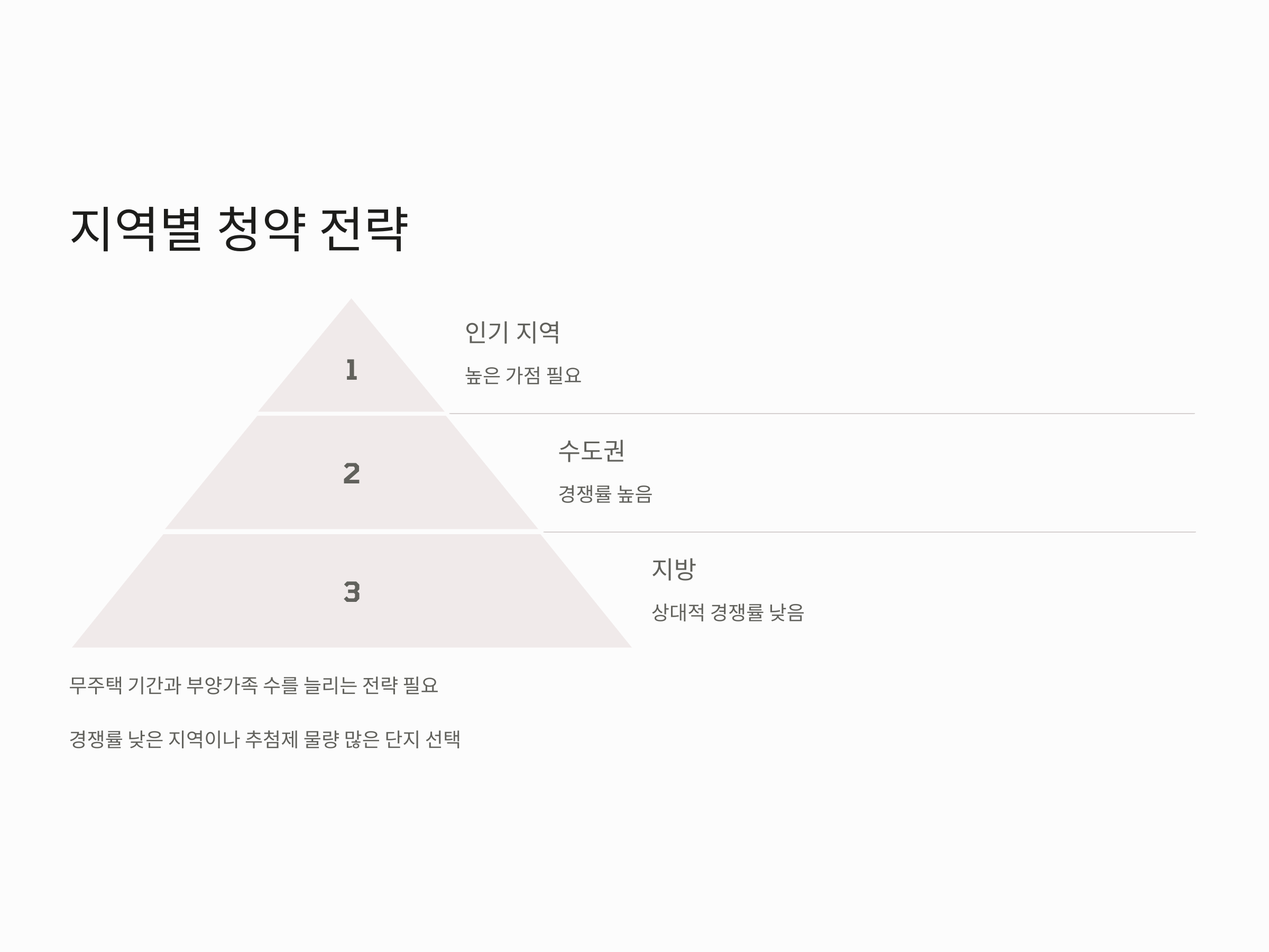 청약 경쟁률은 지역별로 차이가 있습니다. 수도권은 경쟁률이 높고, 지방은 상대적으로 낮습니다. 인기 지역의 경우 가점이 높아야 당첨 가능성이 커지므로 무주택 기간과 부양가족 수를 늘리는 전략이 필요합니다. 경쟁률이 낮은 지역이나 추첨제 물량이 많은 단지를 선택해 지원하는 것도 좋은 방법입니다. citeturn0search4