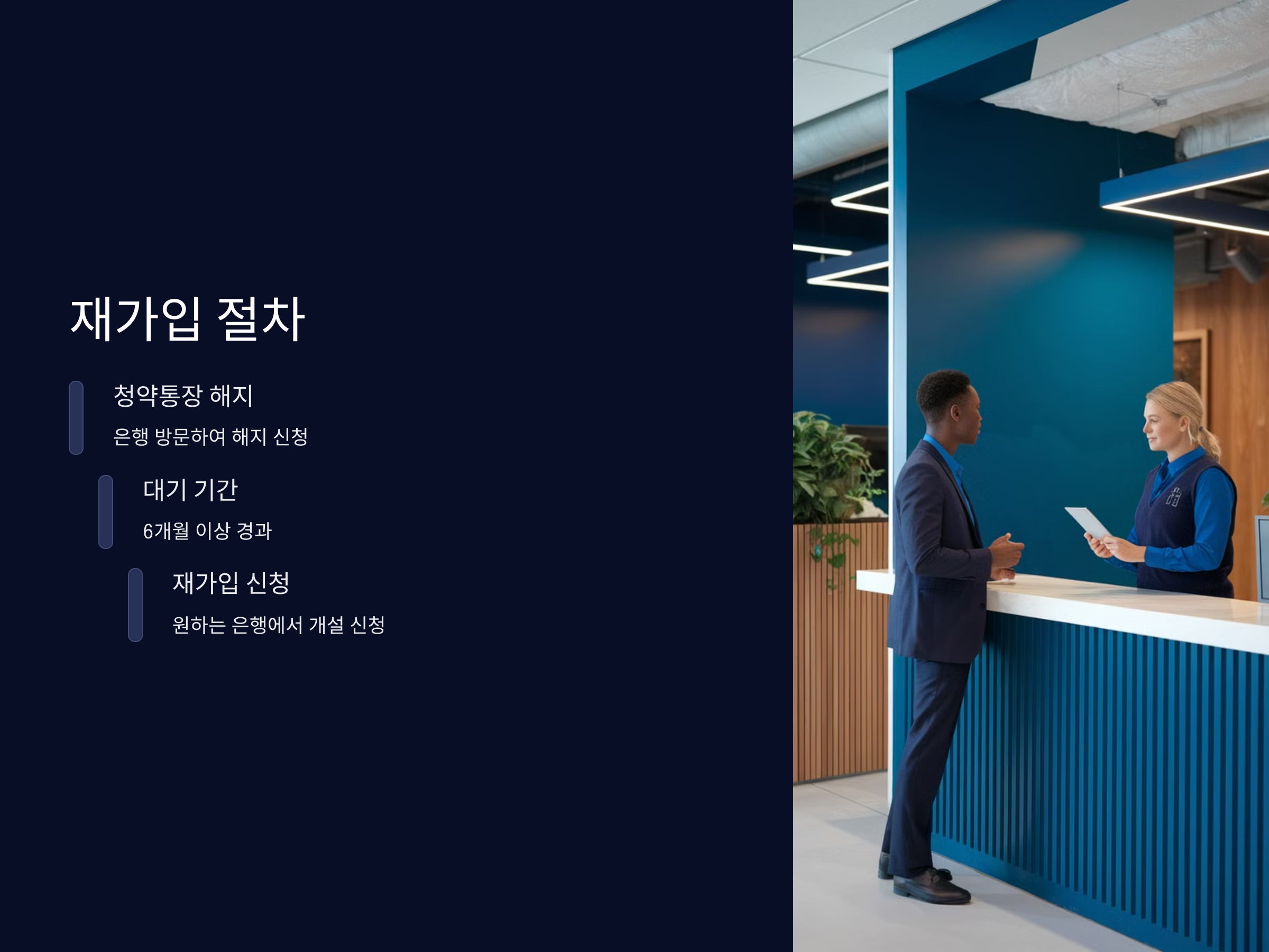 - 재가입 신청: 해지 후 6개월 이상 경과한 뒤, 원하는 은행에 다시 방문하여 청약통장 개설을 신청합니다.