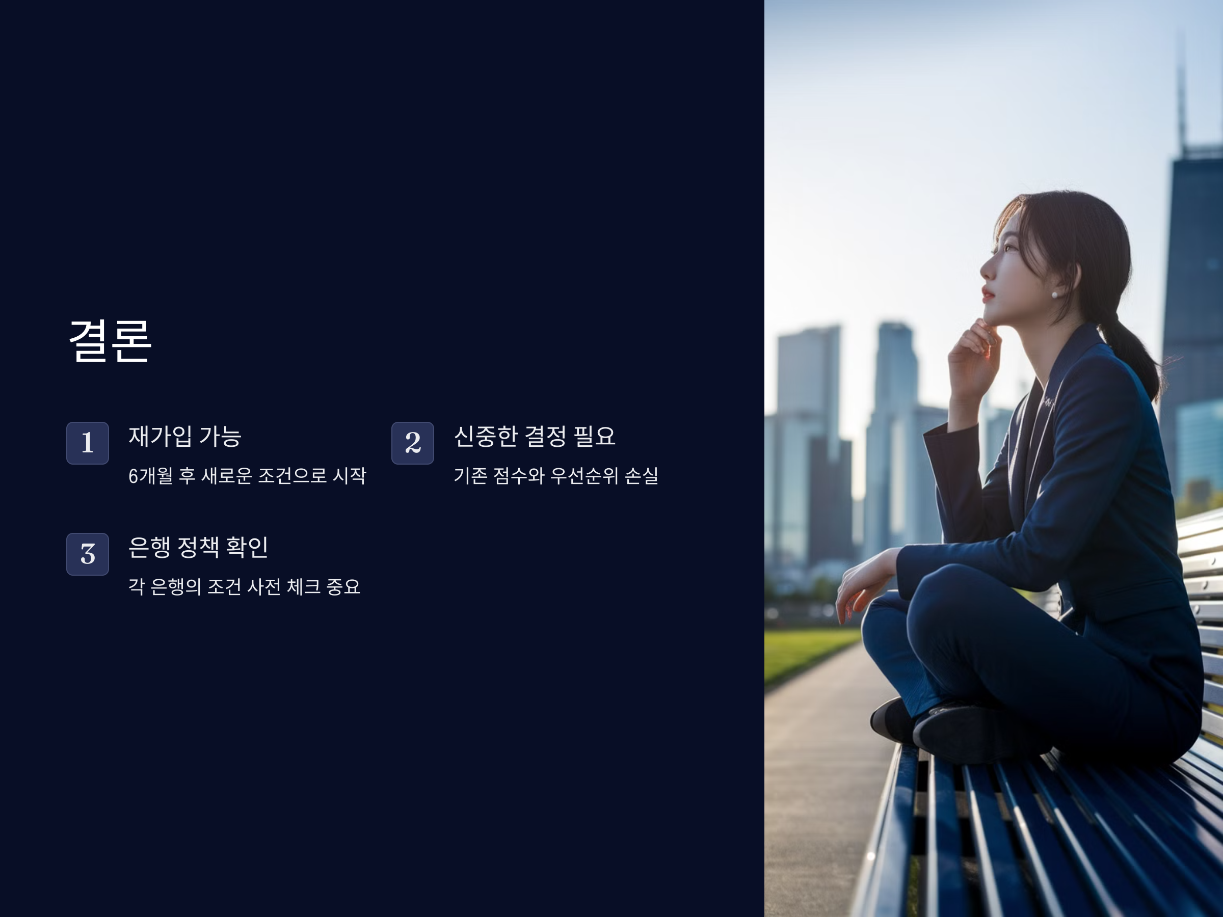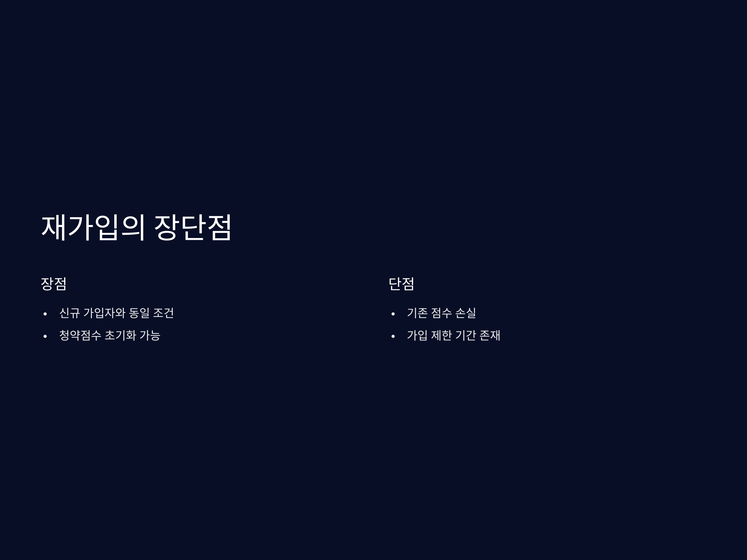 - 재가입 후에는 이전 청약통장의 점수를 사용할 수 없습니다. 새로 시작하는 청약이므로 초기 상태로 점수를 새로 쌓아야 합니다.