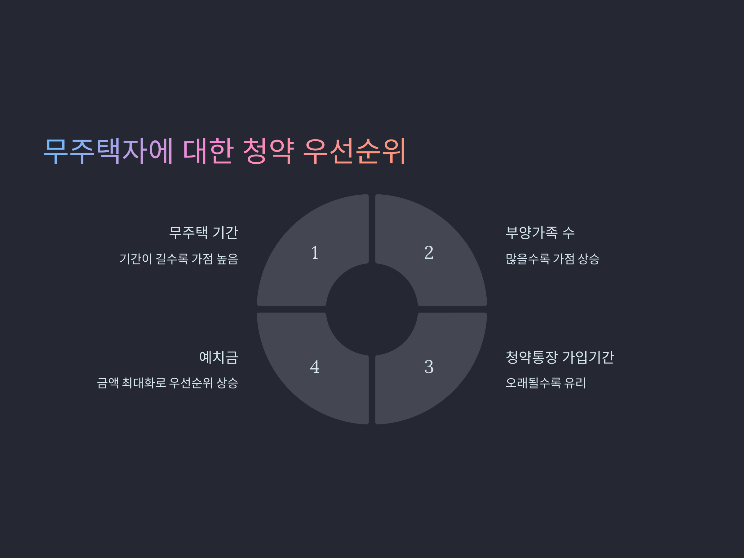 특히, 무주택자의 우선순위는 청약 가점제와 밀접하게 연관되어 있습니다. 청약 가점제는 무주택 기간, 부양가족 수, 청약통장의 가입 기간 등을 종합적으로 고려하여 우선순위를 결정합니다. 따라서, 무주택자라도 청약 통장의 가입 기간과 예치금을 최대화하여 우선순위를 높이는 것이 중요합니다.