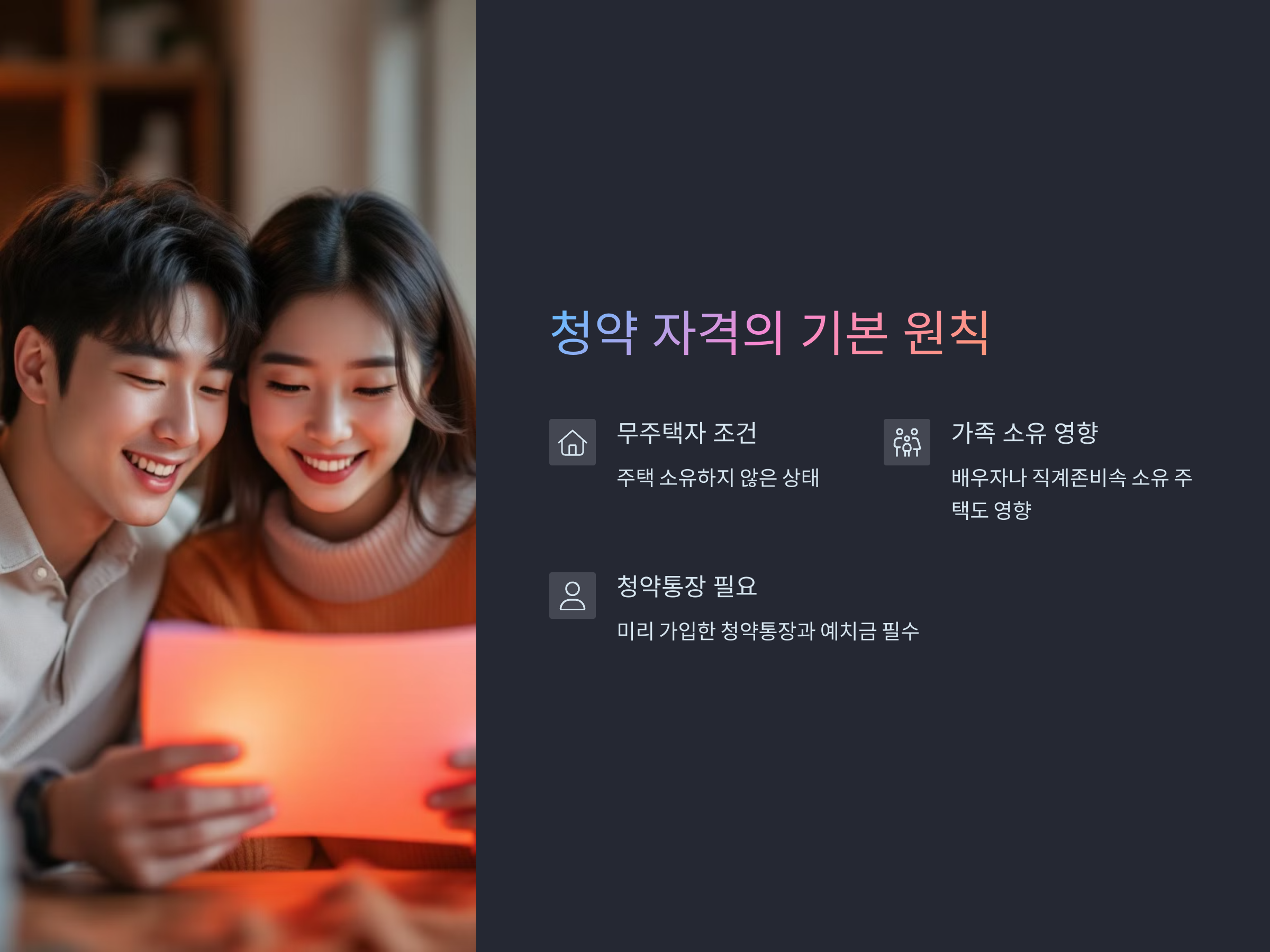 무주택자 자격은 단순히 자신의 명의로 주택을 소유하지 않은 경우뿐만 아니라, 배우자나 직계존비속이 소유한 주택도 영향을 미칩니다. 이러한 경우에는 청약을 신청할 수 없거나, 일정한 조건이 추가될 수 있습니다. 또한 청약을 신청하기 전에 미리 가입한 청약통장과 예치금의 유무도 중요한 조건이므로, 미리 준비해 두는 것이 좋습니다.