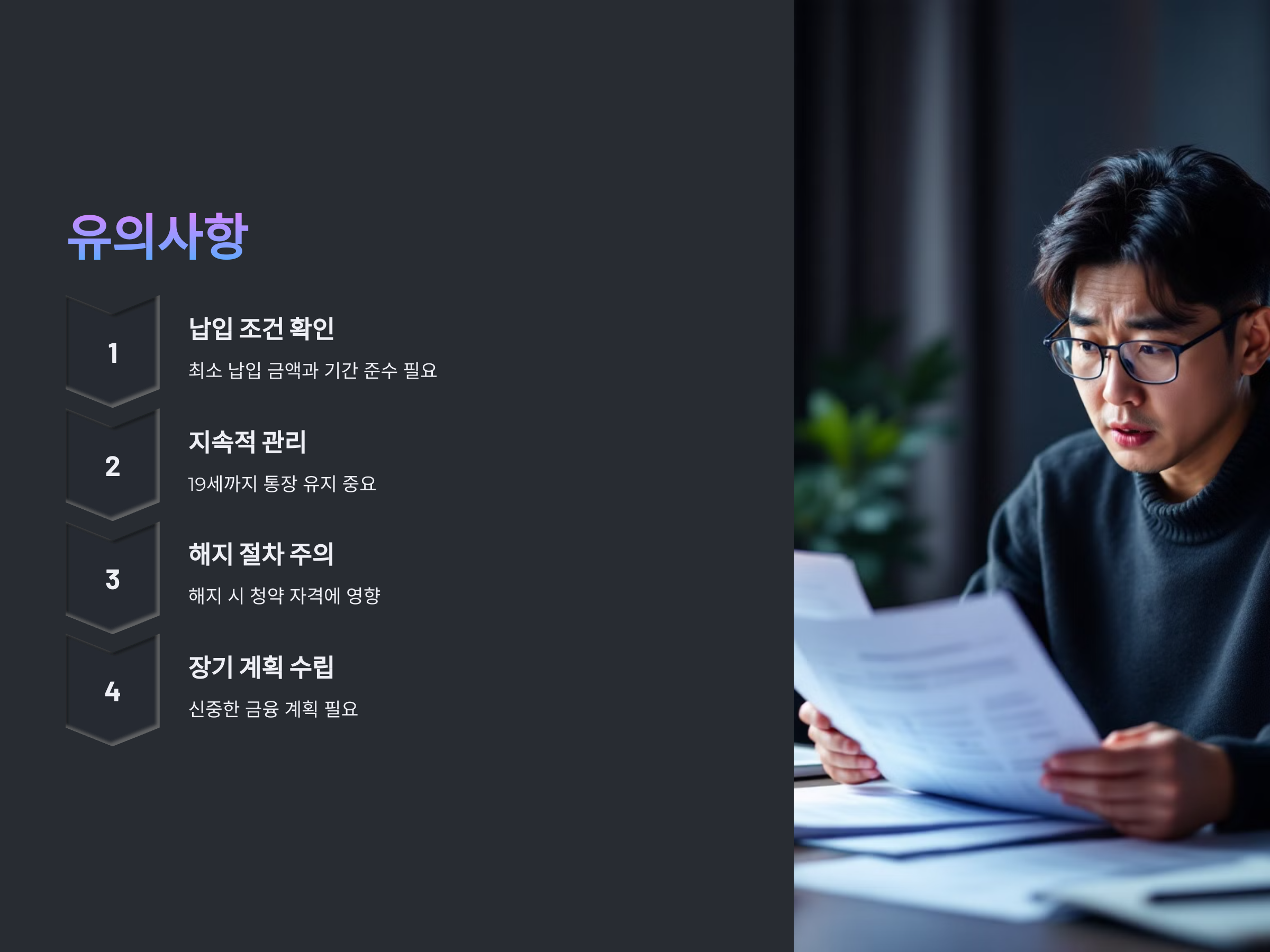 미성년자 청약통장을 가입할 때 유의할 점도 있습니다. 첫 번째로, 청약통장은 최소 납입 금액과 납입 기간이 정해져 있습니다. 이를 충족하지 않으면 청약 자격을 얻을 수 없기 때문에, 납입 기간과 금액을 체크하는 것이 중요합니다. 또한, 만약 자녀가 19세가 되었을 때 청약통장을 유지하지 않으면 청약 자격을 얻을 수 없으므로, 꾸준한 관리가 필요합니다.