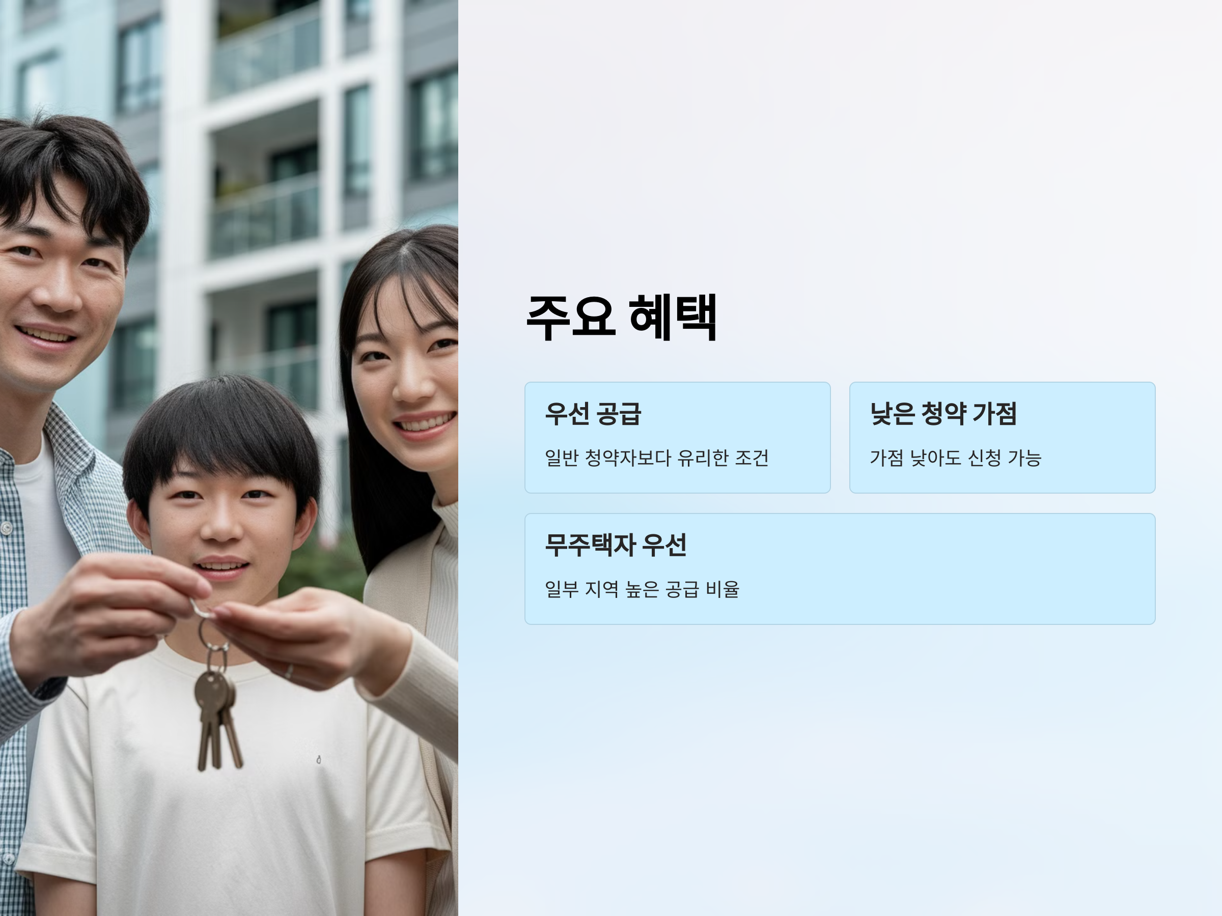 이 제도의 가장 큰 장점은 청약 점수나 자산 수준에 따라 제한 없이 신청할 수 있다는 점입니다. 다만, 자격 요건을 충족하는 사람만이 신청할 수 있으며, 자격을 충족했다고 하더라도 경쟁이 치열할 수 있으므로 충분한 정보와 전략이 필요합니다.