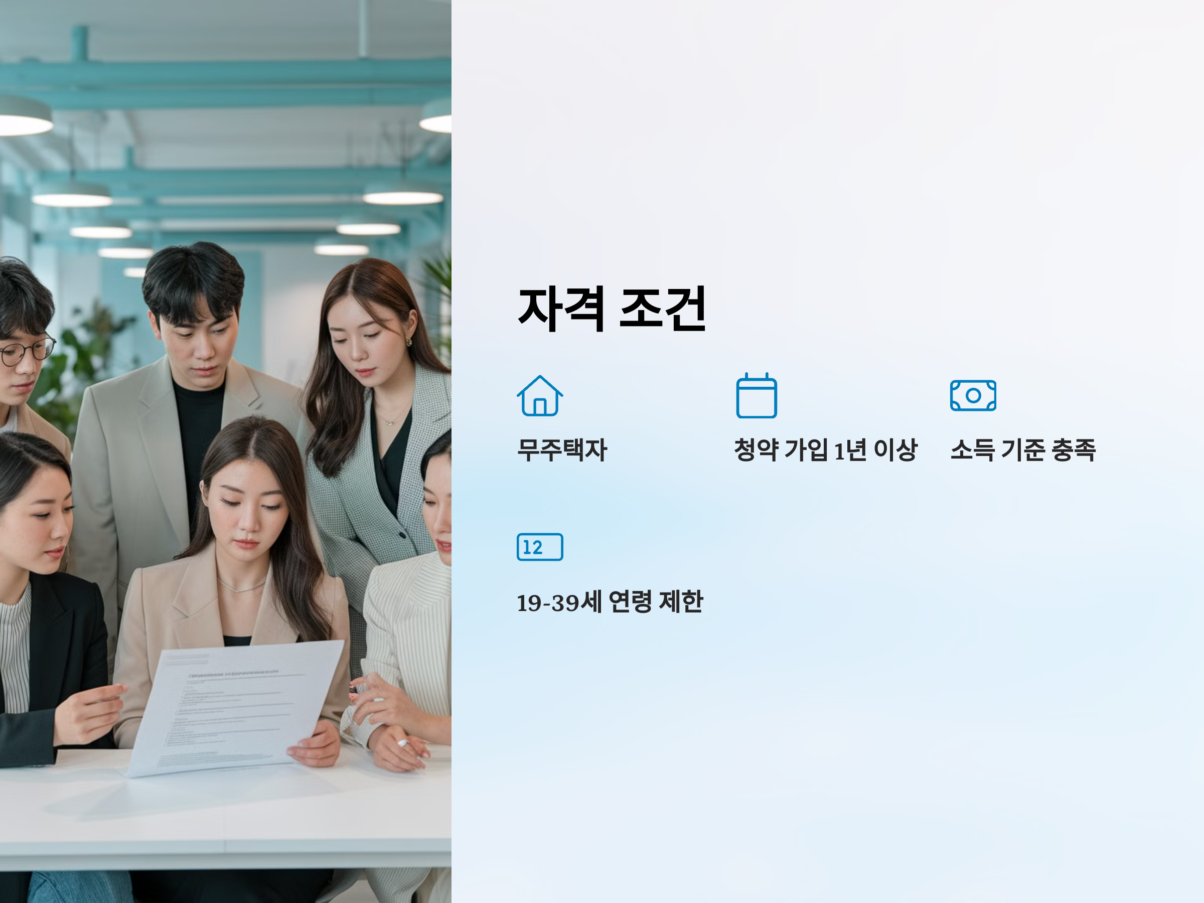 - 청약 가입 기간: 청약에 가입된 지 최소 1년 이상이어야 합니다. 가입 후 1년 이상 경과한 사람만 신청할 수 있습니다.
