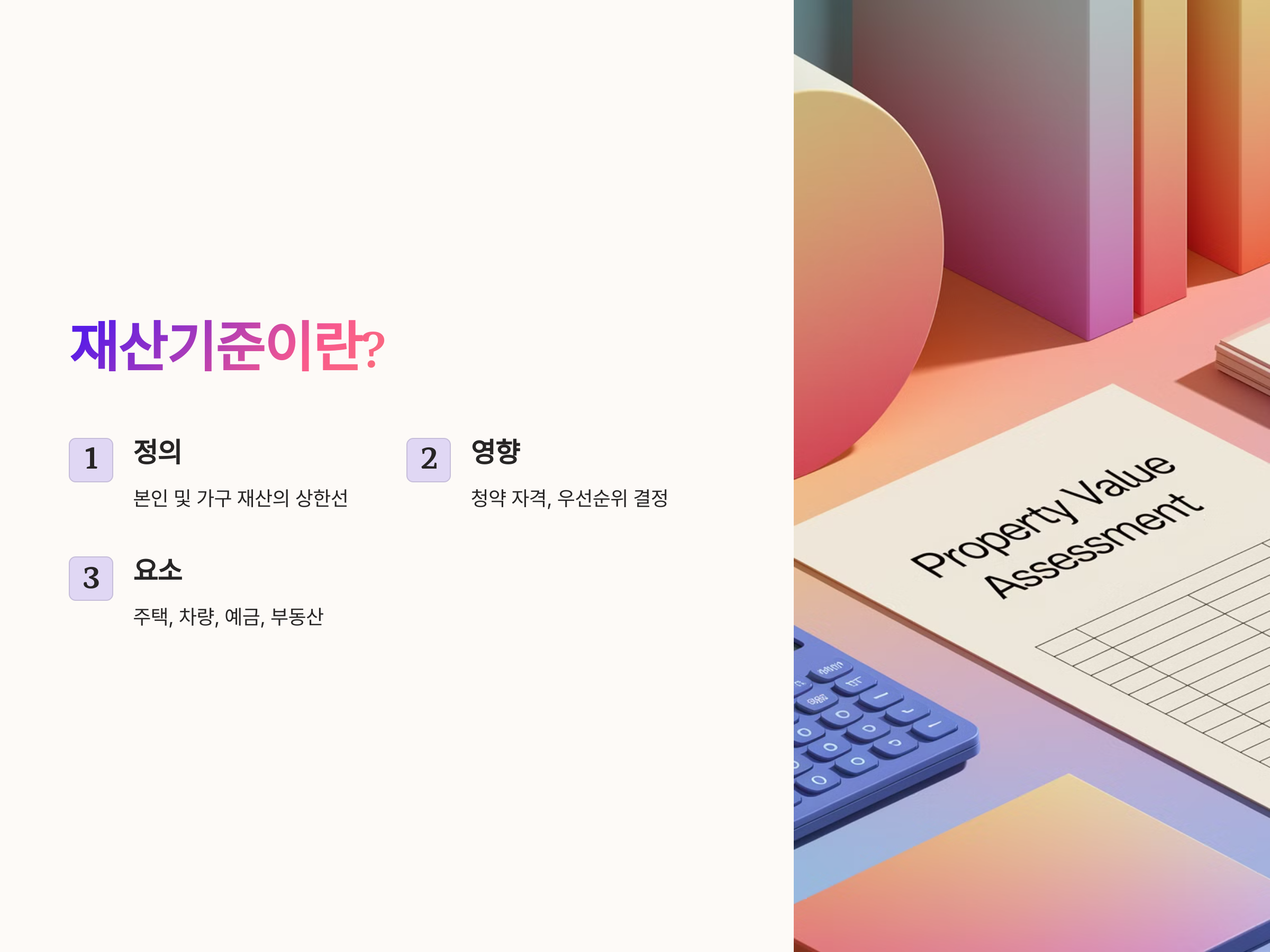 재산기준을 결정하는 주요 요소는 주택자산, 차량자산, 예금 및 부동산 보유 내역 등입니다. 특히 주택자산이 큰 비중을 차지하는데, 이를 통해 자신이 무주택자인지 여부를 판단할 수 있습니다.