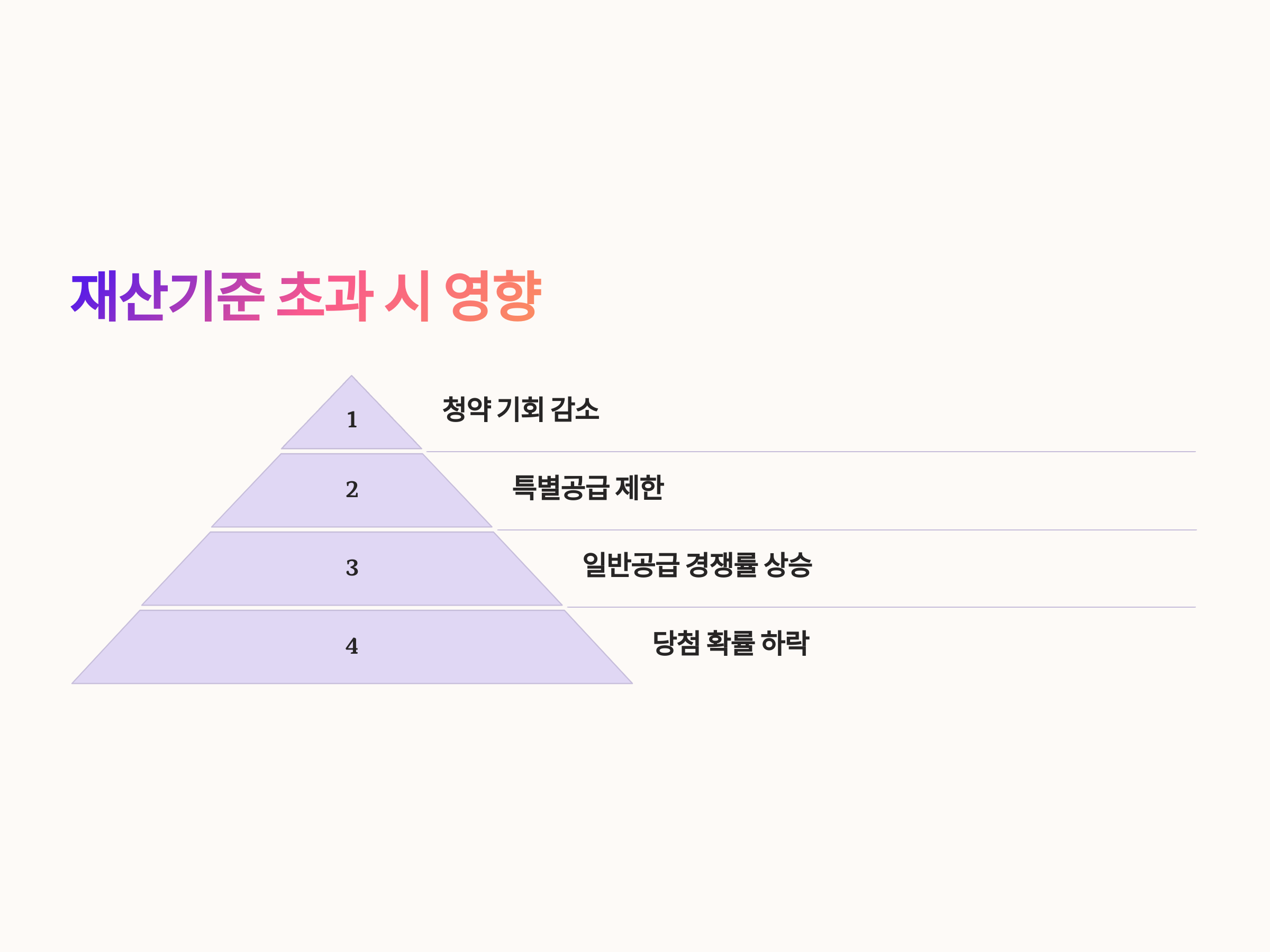 재산기준을 초과하면 청약에 참여할 수 없거나, 참여하더라도 당첨 확률이 크게 낮아집니다. 또한, 특정 청약 유형에는 아예 지원이 불가능할 수 있습니다.