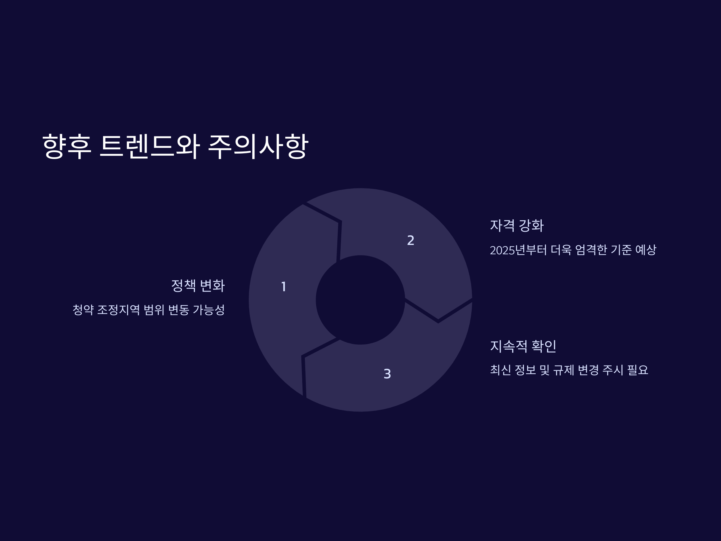 2025년부터는 청약 조정지역에서 청약 자격이 더욱 강화될 가능성이 높습니다. 특히 다주택자와 고소득자에 대한 규제가 강화되며, 청약의 공정성을 높이려는 정책이 시행될 것입니다. 또한, 청약 자격을 얻기 위한 조건들이 더욱 세분화될 예정이므로, 청약을 고려하는 사람들은 각별히 주의해야 합니다.