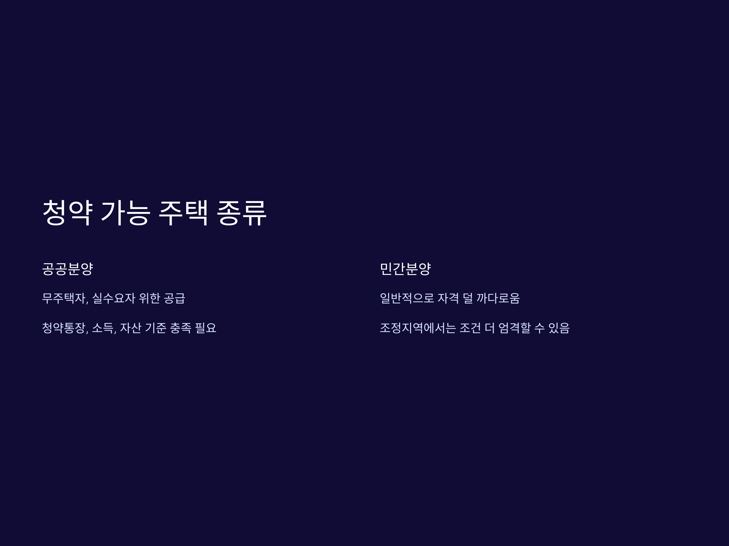 - 민간분양: 민간 건설사가 제공하는 주택으로, 일반적으로 청약 자격이 더 까다롭지 않지만, 조정지역에서는 민간분양에 대한 조건이 다소 더 엄격할 수 있습니다.