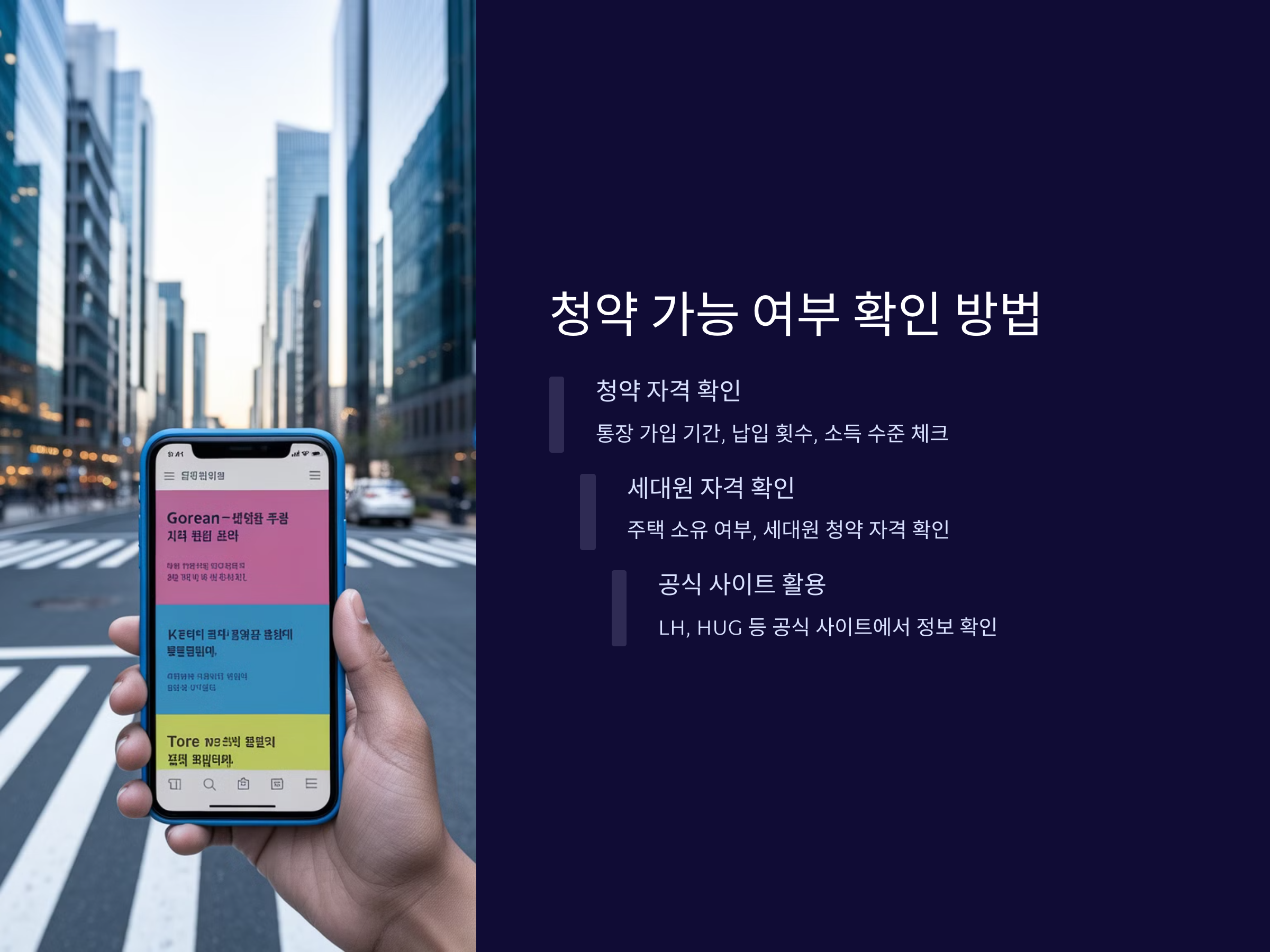 - 청약 자격 확인: 청약 통장 가입 기간, 납입 횟수, 소득 수준 등 개인의 자격을 확인하세요.