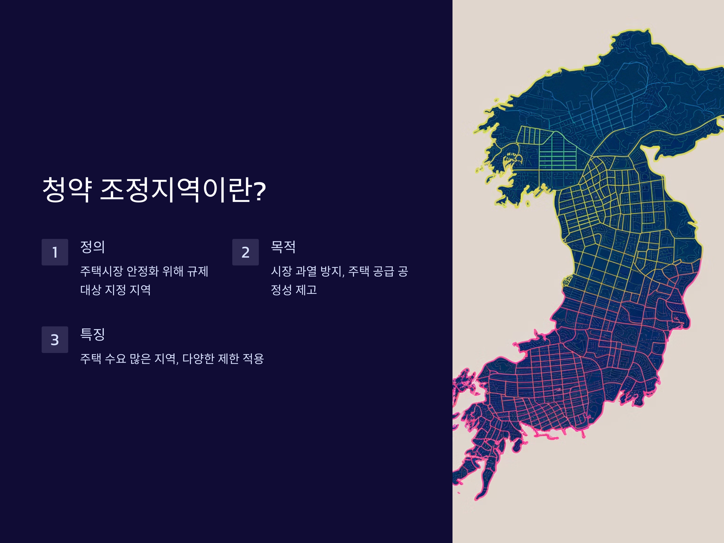 청약 조정지역은 정부가 주택시장 안정화를 위해 특정 지역을 규제 대상으로 지정한 지역을 의미합니다. 일반적으로 청약 조정지역에는 주택 수요가 많은 지역이 포함되며, 이 지역에서 주택을 분양받고자 하는 사람들에게는 다양한 제한이 적용됩니다. 이러한 조정지역은 시장 과열을 방지하고, 청약 제도를 통해 주택 공급의 공정성을 높이기 위한 목적을 가지고 있습니다.