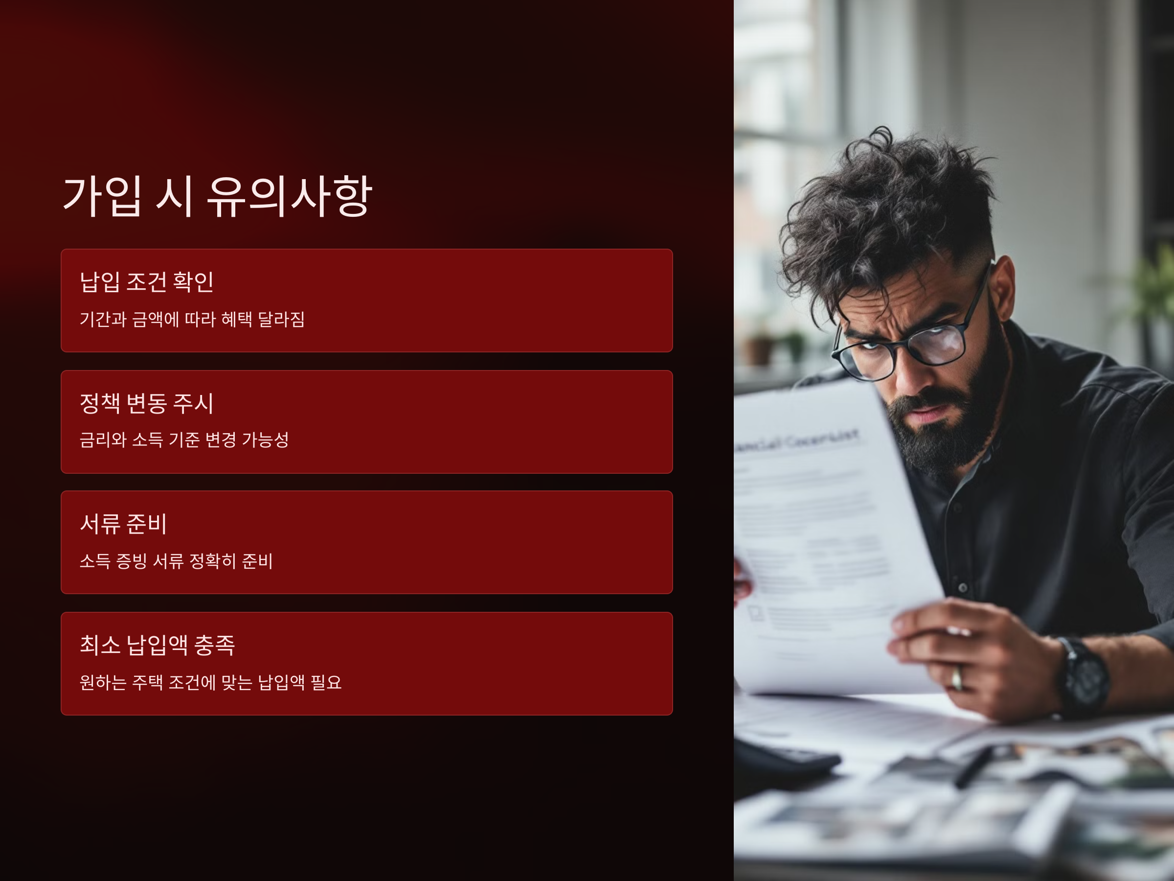 청년우대형청약통장을 가입할 때는 몇 가지 유의사항이 있습니다. 먼저, 이 통장은 납입 기간과 금액에 따라 혜택이 달라지므로, 청약을 원하는 주택의 조건에 맞는 최소 납입액을 충족해야 합니다.