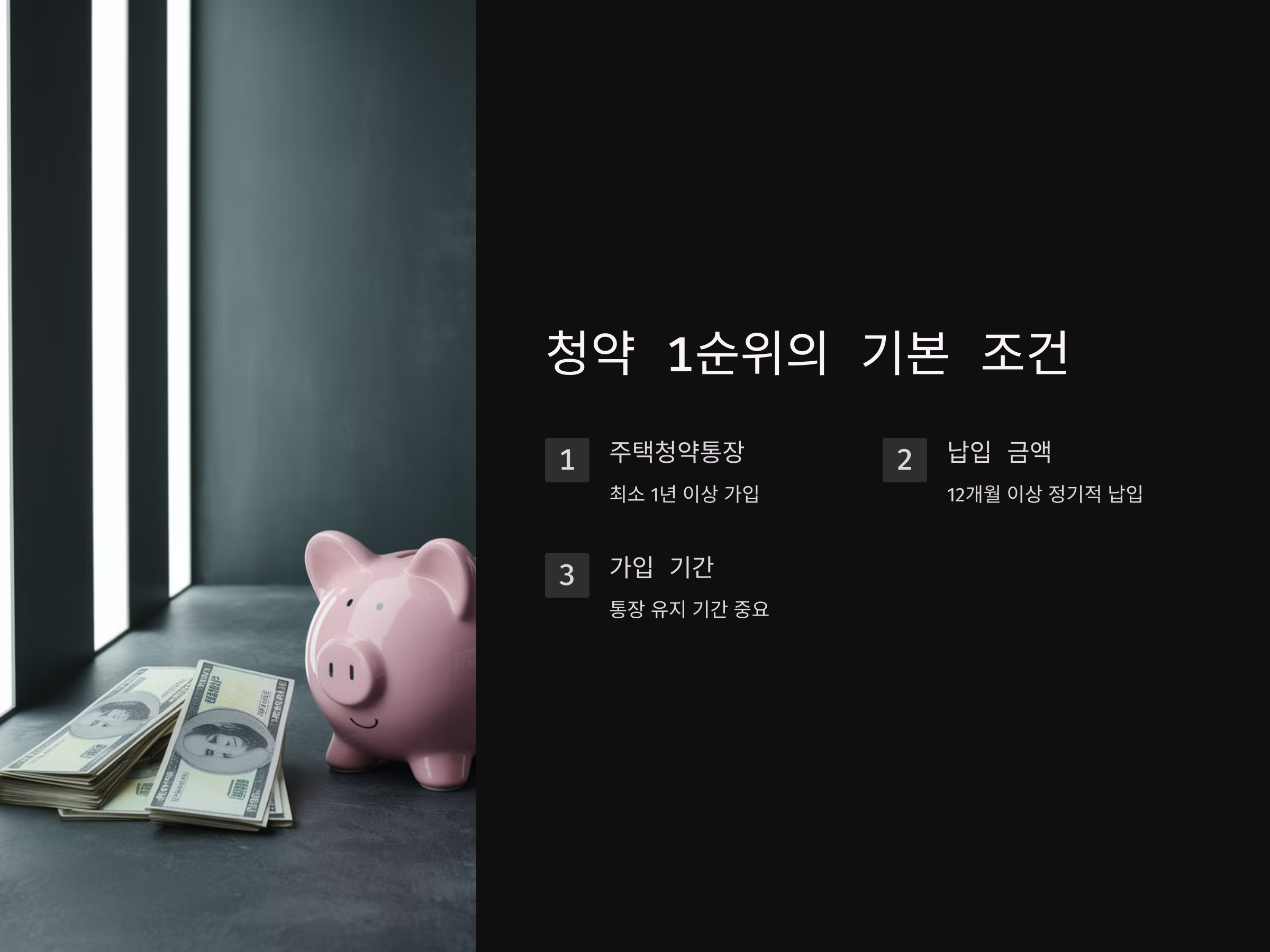 따라서, 1순위 청약 조건을 얻기 위한 첫 번째 조건은 바로 "주택청약통장의 가입 기간"과 "납입 금액"을 충족하는 것입니다.