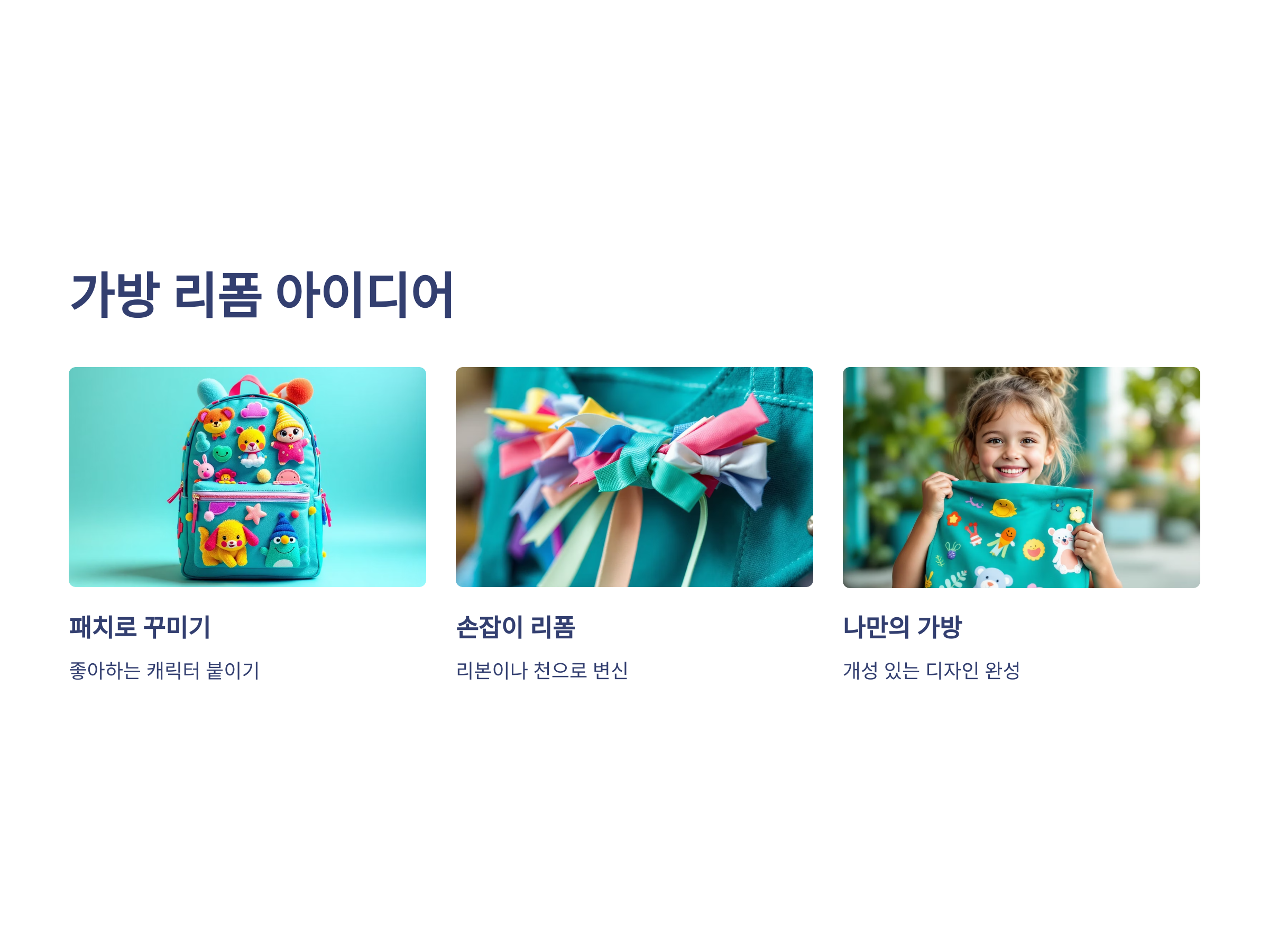 가방에 귀여운 패치를 여러 개 붙이면, 아주 간단하게 나만의 가방을 만들 수 있습니다. 다양한 캐릭터나 아이가 좋아하는 모양을 선택하여 가방에 붙여보세요. 리본을 달아 주면 더욱 예쁜 가방이 될 거예요!