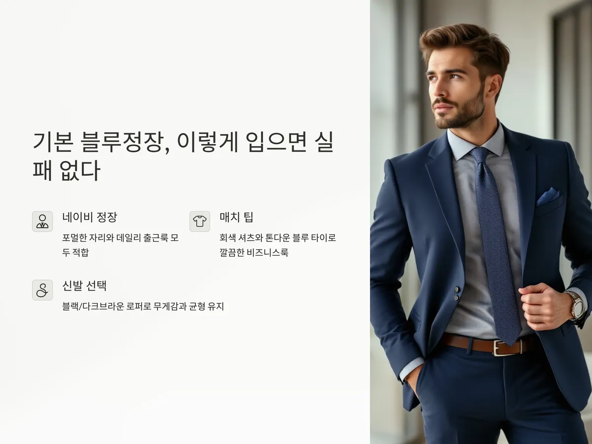 블루정장은 색감이 강하지 않으면서도 개성을 드러낼 수 있는 최고의 아이템입니다. 가장 기본이 되는 네이비 정장은 포멀한 자리뿐 아니라 데일리 출근룩으로도 손색이 없습니다. 특히 회색 셔츠와 톤 다운된 블루 타이를 매치하면 깔끔한 비즈니스룩이 완성됩니다.