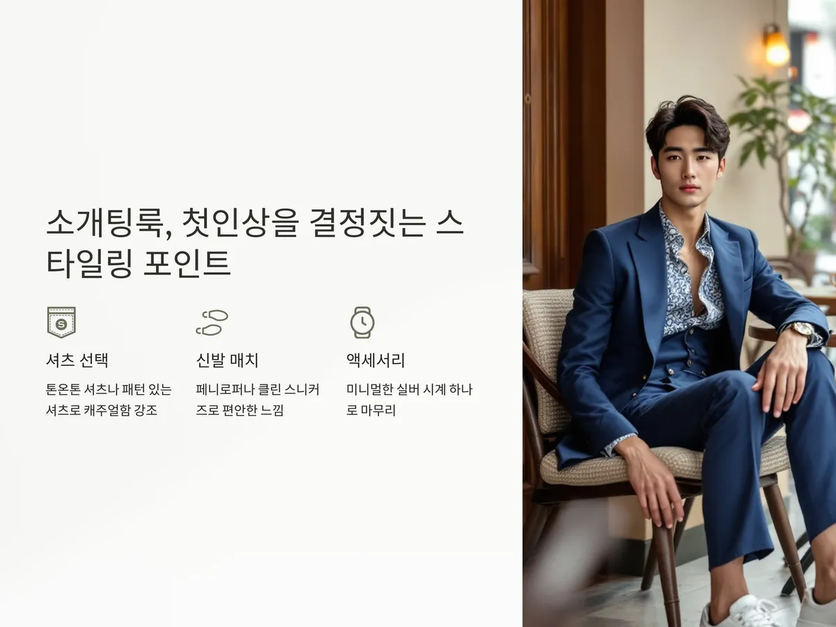 블루정장을 소개팅에 활용할 때는 신뢰감 있는 인상을 주되, 너무 격식을 차리면 오히려 거리감이 생길 수 있습니다. 그러므로 톤온톤 셔츠나 패턴 있는 셔츠로 캐주얼함을 더해주고, 타이는 생략하거나 니트 타이로 부드러운 이미지를 연출하는 것이 좋습니다.