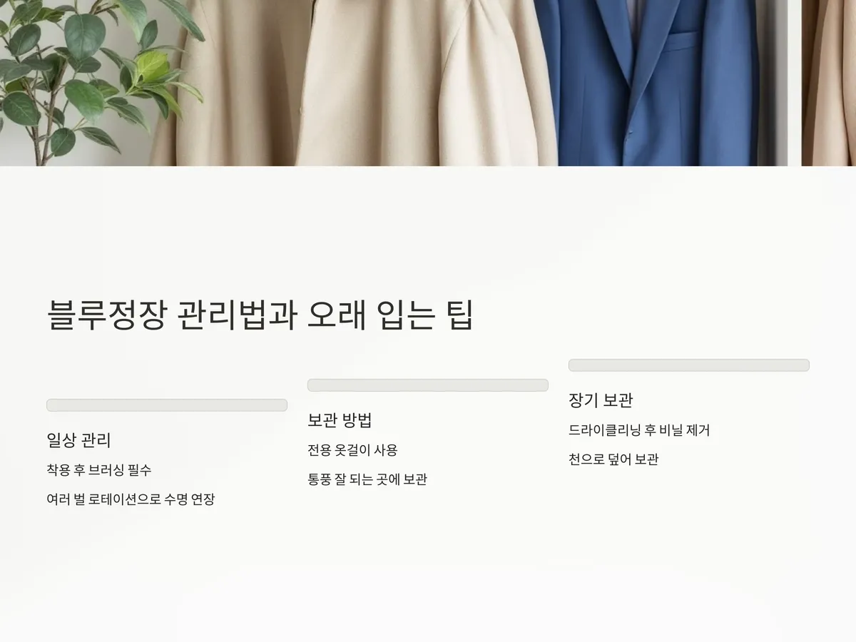 정장은 스타일링도 중요하지만, 그 못지않게 관리법이 스타일을 좌우합니다. 블루정장은 밝은 색감일수록 먼지나 오염이 눈에 띄기 쉬우므로 착용 후 브러싱은 필수입니다. 또, 한 벌을 자주 입기보단 여러 벌을 로테이션하면서 입는 것이 옷의 수명을 늘리는 데 도움이 됩니다.