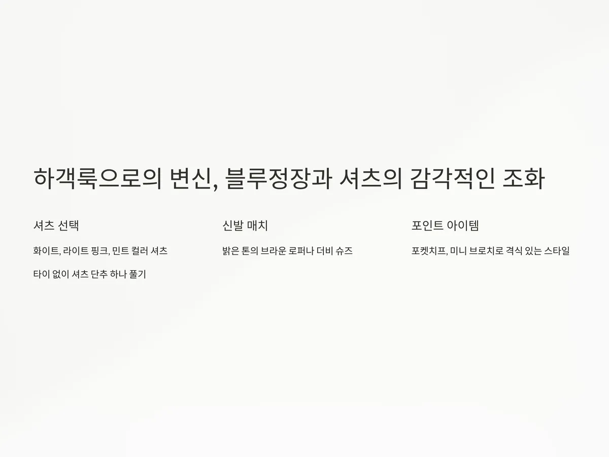 슬림핏이나 노치드 라펠 디자인은 몸의 실루엣을 살리며 트렌디한 느낌을 주고, 정장 팬츠의 경우 발목이 살짝 드러나는 9부 스타일로 입으면 더 세련된 분위기를 연출할 수 있습니다. 여기에 블랙 혹은 다크브라운 로퍼를 더하면 무게감과 균형을 맞출 수 있습니다.