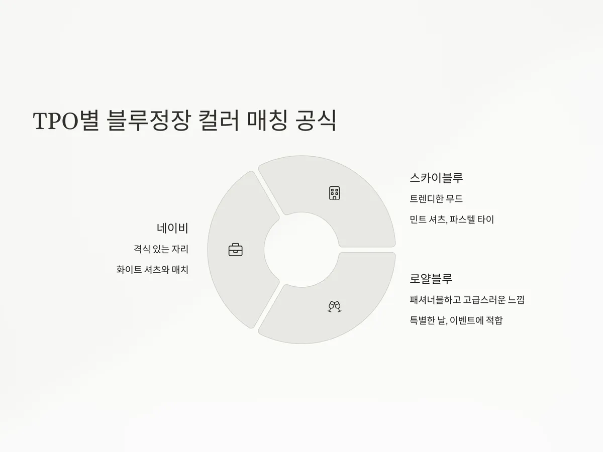 예를 들어 회의나 프레젠테이션 자리에는 네이비와 화이트 셔츠, 출근이나 데일리룩에는 스카이블루 정장과 민트 셔츠, 파스텔 계열 타이를 추천합니다. 로얄블루 정장은 연회나 이벤트에서 시선을 사로잡을 수 있어 특별한 날에 적합합니다.