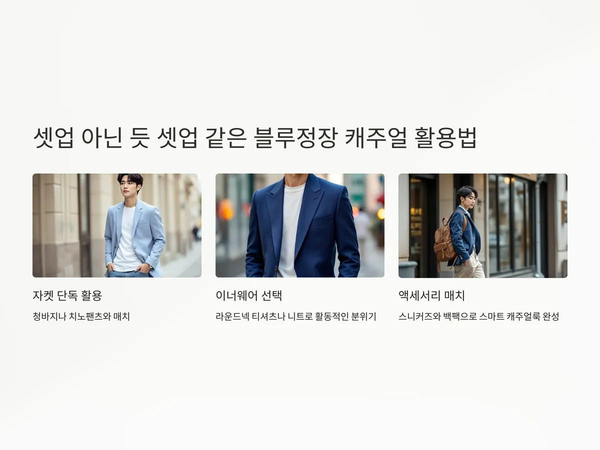 요즘은 포멀한 정장도 일상에서 가볍게 활용하는 경우가 많아졌습니다. 블루정장 자켓을 단독으로 활용해 청바지나 치노팬츠와 매치하면 감각적인 캐주얼룩으로 변신할 수 있습니다. 특히 라이트블루 자켓은 여름 시즌에 시원하고 청량한 느낌을 줘 활용도가 매우 높습니다.