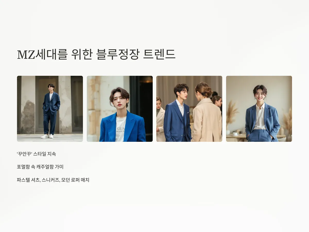 또한 MZ세대를 중심으로 '꾸안꾸' 스타일이 여전히 지속되면서, 포멀함 속에 캐주얼함을 가미한 정장 활용법이 각광받고 있습니다. 최근에는 블루정장을 활용한 '하객룩', '면접룩', '소개팅룩'이 SNS와 패션 유튜브를 통해 많이 소개되고 있으며, 특히 파스텔 계열 셔츠나 스니커즈, 모던 로퍼 등을 매치한 스타일이 실용성과 감각을 동시에 만족시켜 인기를 끌고 있죠. 그럼 블루정장 코디법을 본격적으로 살펴보겠습니다.