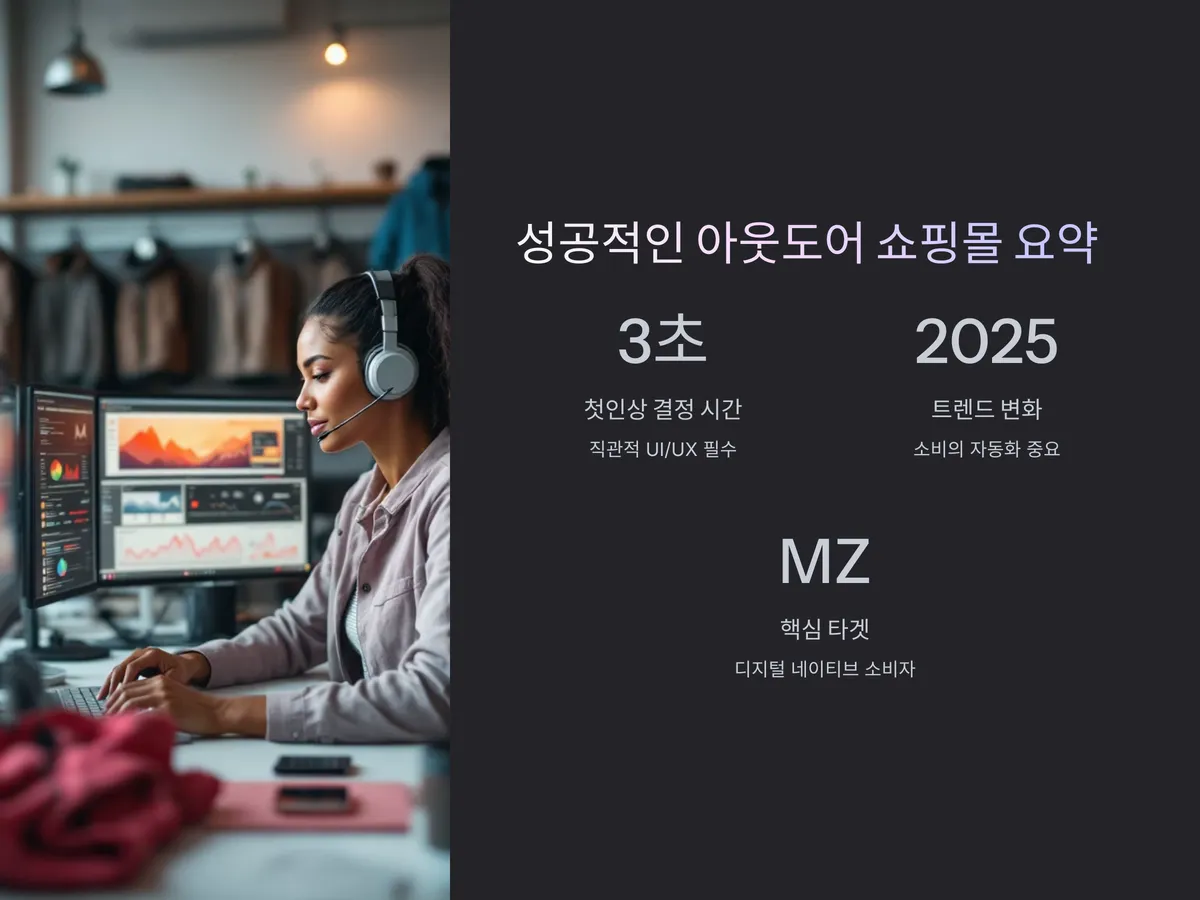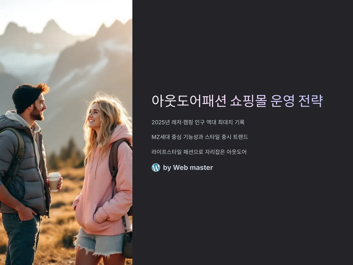 2025년 들어 레저·캠핑 인구가 역대 최대치를 기록하면서 아웃도어 시장은 그 어느 때보다 활기를 띠고 있습니다. 특히 MZ세대를 중심으로 기능성은 물론 스타일을 중요시하는 트렌드가 급부상하며, 아웃도어 패션은 더 이상 등산복이 아닌 일상 속에서도 존재감을 드러내는 '라이프스타일 패션'으로 자리잡고 있습니다. 이런 흐름은 온라인 쇼핑몰 시장에도 큰 영향을 미쳐, 감각적인 브랜드 스토리와 제품 구성을 갖춘 아웃도어 패션 쇼핑몰이 높은 성장세를 보이고 있습니다. 또한 인스타그램, 유튜브 숏폼, 네이버 쇼핑라이브와 같은 플랫폼을 적극 활용한 ‘콘텐츠 커머스’ 전략이 주효해, 단순한 제품 나열이 아닌 스토리텔링 중심의 마케팅이 필수가 되고 있습니다. 2025년 트렌드 보고서에 따르면, 아웃도어 패션 카테고리에서 '디지털 네이티브' 소비자를 위한 맞춤형 쇼핑몰 운영 전략이 쇼핑몰 성패를 좌우할 핵심요소로 떠올랐습니다. 이제는 단순히 예쁜 디자인을 넘어서 브랜드의 세계관과 철학, 고객 경험이 어우러지는 방식으로 접근해야 경쟁력 있는 아웃도어 패션 쇼핑몰이 될 수 있습니다.