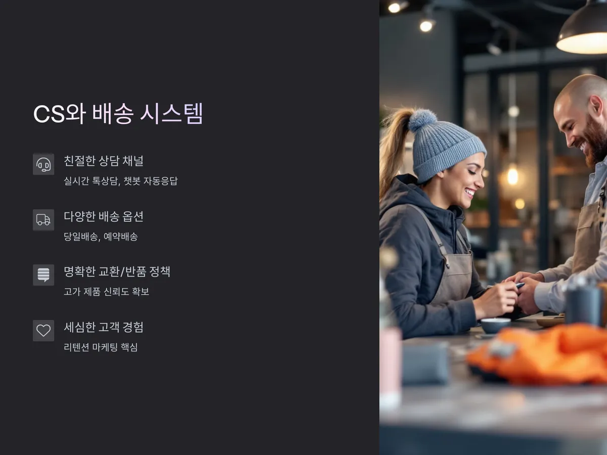 고객이 쇼핑몰을 단골로 만드는 요소 중 하나는 ‘경험의 품질’입니다. 아무리 좋은 제품이라도 CS가 불편하거나 배송이 느리면 재구매율은 급격히 낮아집니다. 아웃도어 패션 제품은 가격대가 높은 경우가 많기 때문에, 교환/반품 정책이 명확하고 친절한 상담 채널이 필수입니다. 최근에는 챗봇 자동응답 서비스, 실시간 톡상담 도입으로 응대 만족도를 높이고 있으며, 당일배송/예약배송 등 다양한 옵션도 경쟁력을 높이는 방법입니다. 고객의 작은 불편도 놓치지 않는 세심함은 리텐션 마케팅의 핵심입니다.