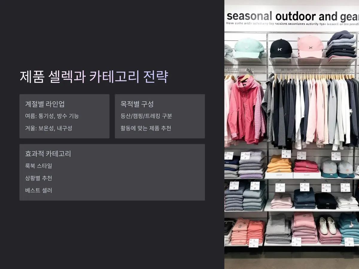아웃도어 제품은 계절, 지역, 사용자 성향에 따라 셀렉 전략이 달라져야 합니다. 여름에는 통기성과 방수 기능이 강조된 제품, 겨울에는 보온성과 내구성이 강화된 제품이 중심이 되어야 하며, 등산/캠핑/트레킹 등 목적별 라인업을 구분하여 고객이 자신의 활동에 맞는 제품을 쉽게 찾을 수 있도록 구성해야 합니다. 카테고리는 단순히 ‘상의/하의’ 구분보다는 ‘룩북 스타일’, ‘상황별 추천’, ‘베스트 셀러’ 방식이 전환율을 높이는 데 효과적입니다. 고객이 목적을 가지고 방문했을 때 그 니즈에 딱 맞는 제품을 제공하는 구조가 중요합니다.