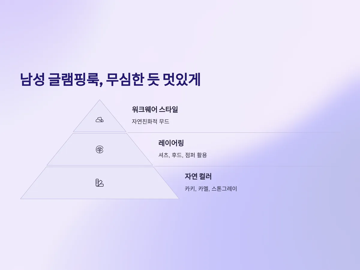 남성 글램핑 패션은 편안함과 터프함의 균형이 중요합니다. 오버핏 티셔츠, 베이지톤의 조거 팬츠, 그리고 워크웨어 스타일의 자켓은 남성미를 강조하면서도 자연친화적인 무드를 자아냅니다. 여기에 워커나 트레킹화 같은 신발을 매치하면 활동성도 보장되며, 스타일도 업그레이드됩니다.