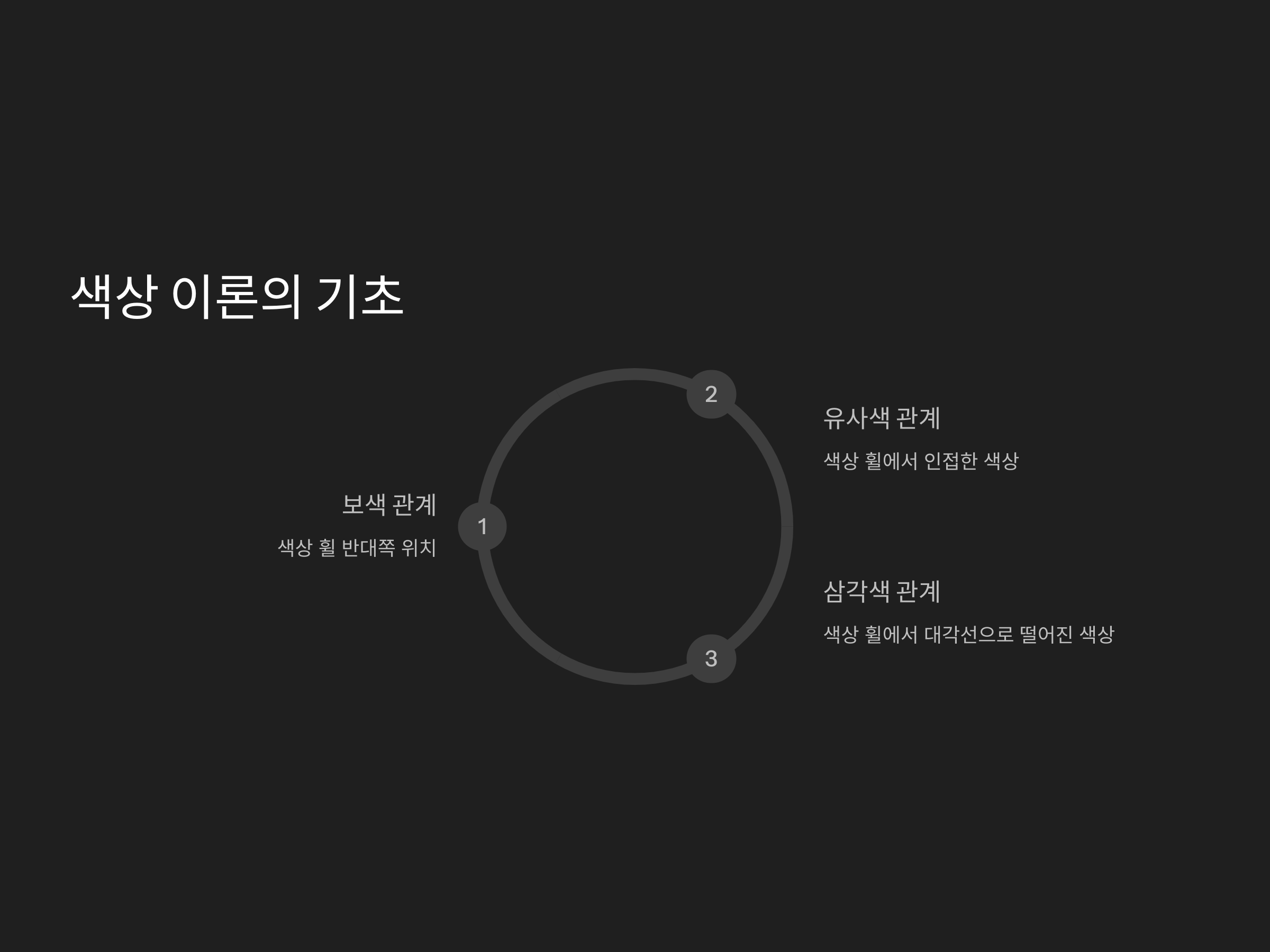 색상 휠은 주로 세 가지 기본적인 색상 관계로 나뉩니다: 보색, 유사색, 삼각색 조합입니다. 이들 각각은 색상 간의 관계를 나타내며, 이 관계에 따라 색상을 어떻게 배치할지 결정할 수 있습니다.
