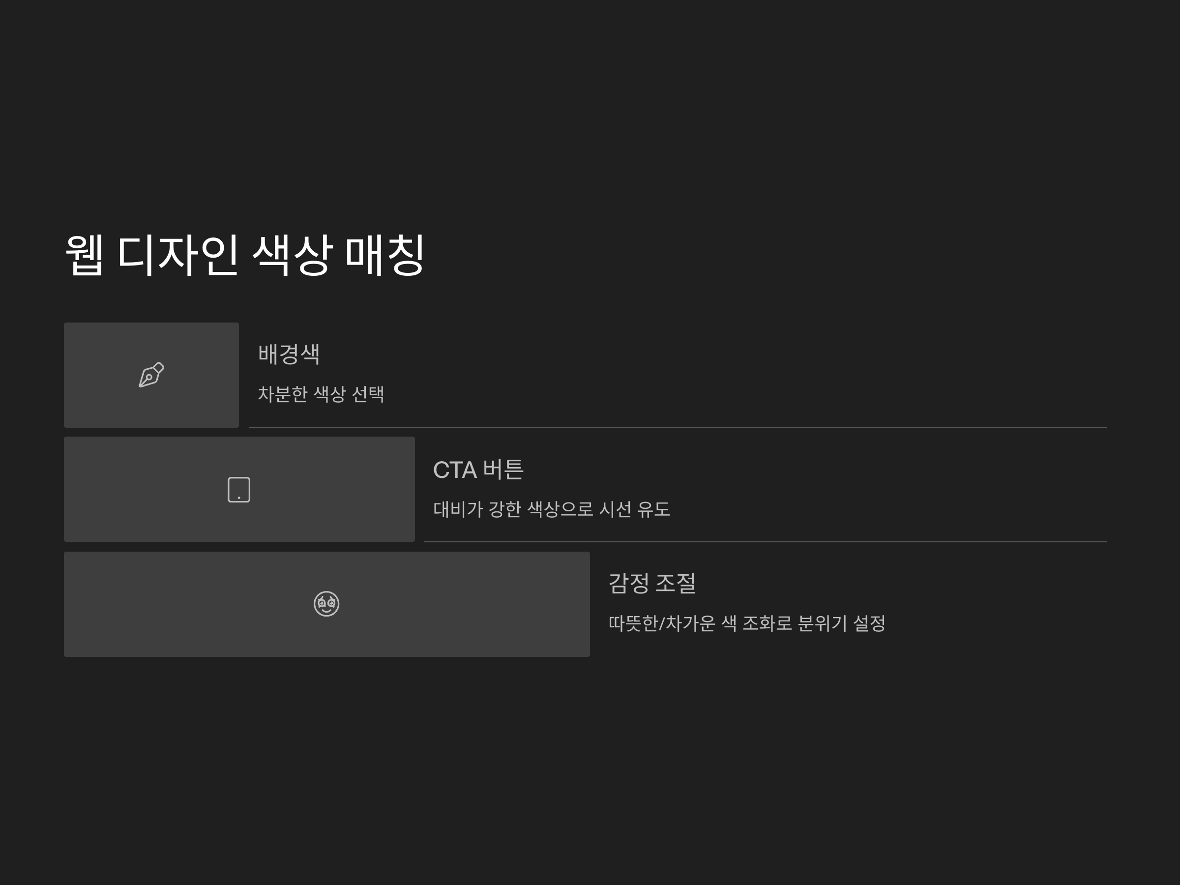 웹 디자인에서도 색상 매칭은 방문자의 시각적인 경험을 크게 좌우합니다. 예를 들어, 배경색은 보통 차분한 색상을 선택하고, CTA 버튼이나 주요 링크는 대비가 강한 색상으로 설정하여 사용자의 눈에 잘 띄게 할 수 있습니다. 또한, 따뜻한 색과 차가운 색을 조화시켜 방문자가 페이지에서 느끼는 감정이나 분위기를 조절할 수 있습니다.