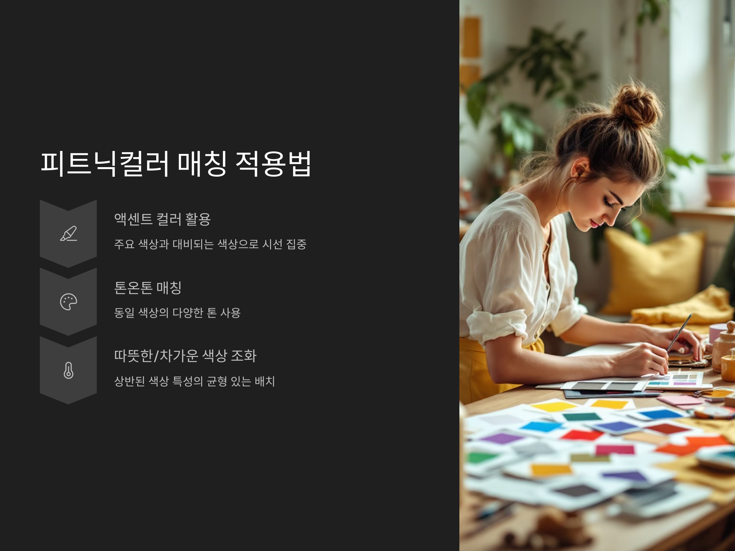 피트닉컬러 매칭을 실제로 적용할 때는 색상 휠을 활용한 기본 원칙 외에도 다양한 요소들을 고려해야 합니다. 여기서는 디자인이나 의상에서 잘 활용할 수 있는 컬러 매칭 방법을 소개합니다.