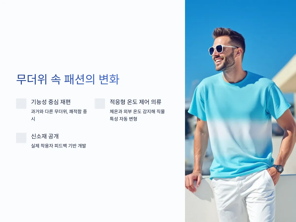 기존의 여름 패션은 단순히 얇고 밝은 색의 옷으로 대체되던 경향이 강했습니다. 하지만 최근 무더위는 과거와 차원이 다르고, 이에 따라 패션 트렌드도 기능성과 쾌적함 중심으로 재편되고 있습니다. 특히 이번 박람회에서는 냉감 기능을 넘어선 '적응형 온도 제어 의류'가 선보이면서 많은 관심을 받고 있습니다.