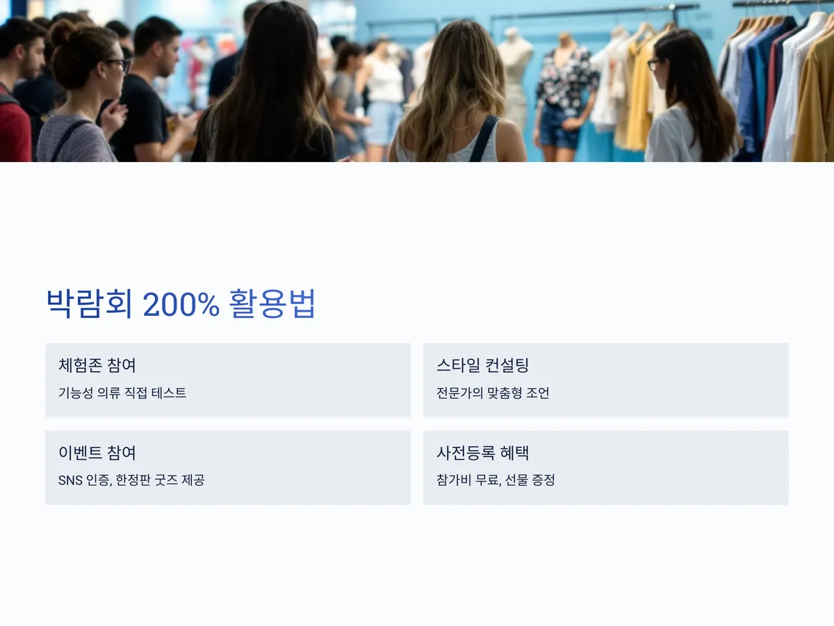 무더위패션 박람회는 단순히 관람만으로 끝나는 행사가 아닙니다. 관람객을 위한 ‘기능성 의류 체험존’, ‘스타일 컨설팅 부스’, ‘AI 패션 퀴즈 이벤트’ 등 다채로운 참여형 프로그램이 마련되어 있어 관람의 재미와 정보를 동시에 누릴 수 있습니다.